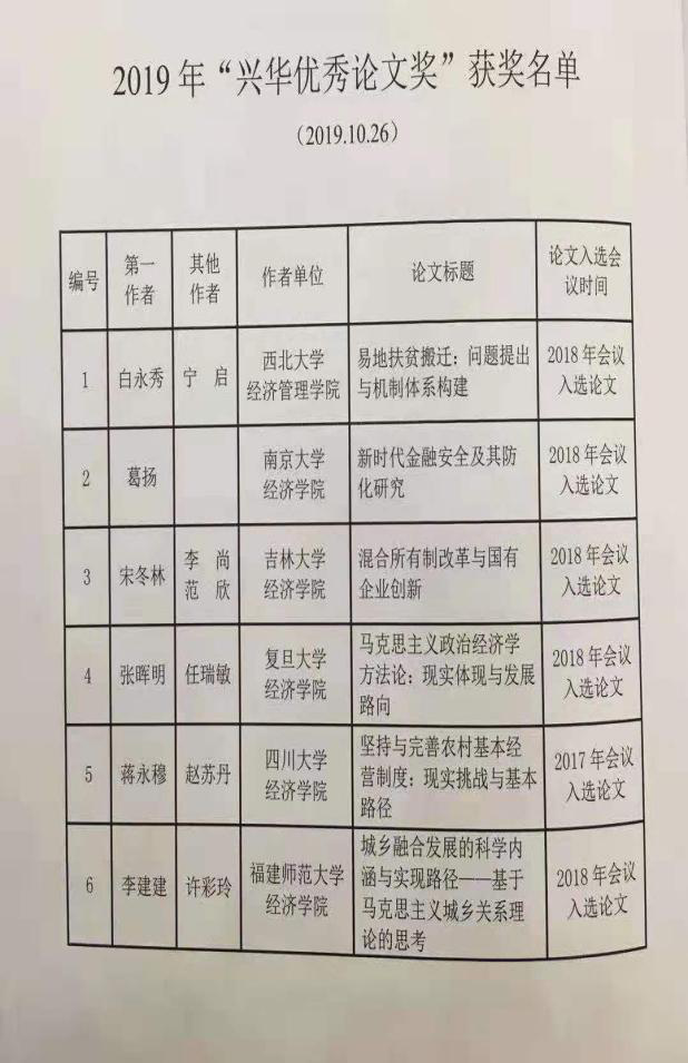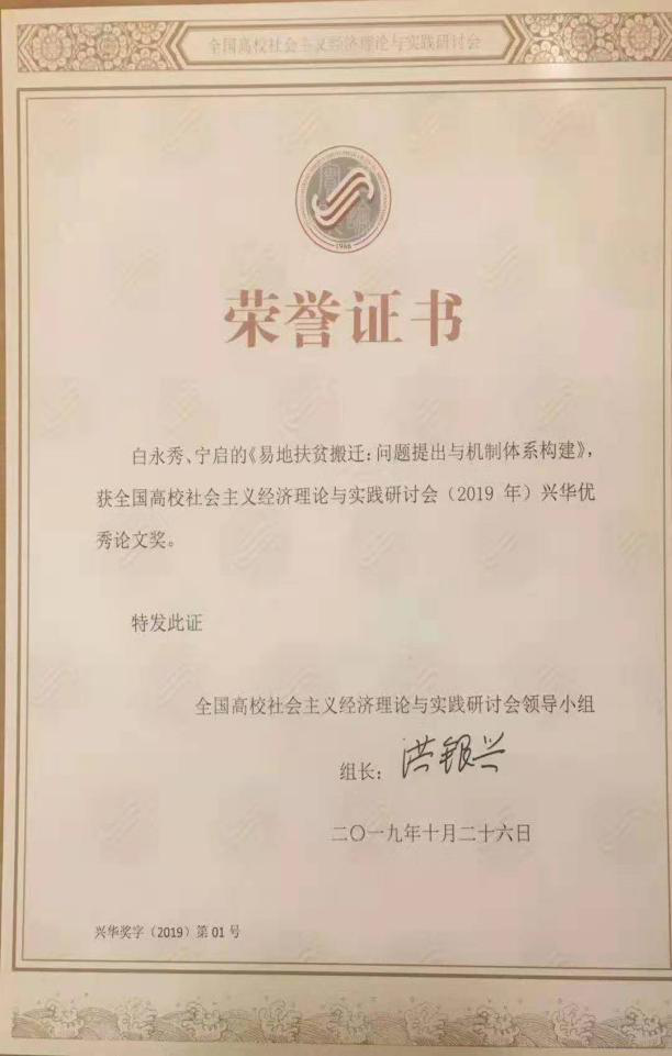 10月26日,全国高校社会主义经济理论与实践研讨会(第33次会议)暨教育部高等学校经济学专业教学指导委员会第三次全体会议在南开大学召开。本次会议,公司白永秀教授和宁启博士的论文《易地扶贫搬迁:问题提出与机制体系构建》荣获全国高校社会主义经济理论与实践研讨会(2019年)“兴华优秀论文奖”。这是继任保平教授(2017年)之后,公司第二次获得“兴华优秀论文奖”。