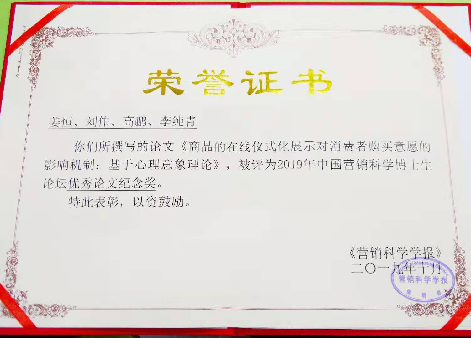 公司硕士研究生姜恒同学为第一作者的论文《商品的在线仪式化展示对消费者购买意愿的影响:基于心理意象加工理论》经过同行专家的多轮评审最终荣获博士生论坛优秀论文入围纪念奖(综合排名第九)。该论文是在刘伟副教授的精心指导下完成的,也吸收了高鹏副教授和李纯青教授的修改意见,是公司市场营销研究团队建设的一个重要成果。
