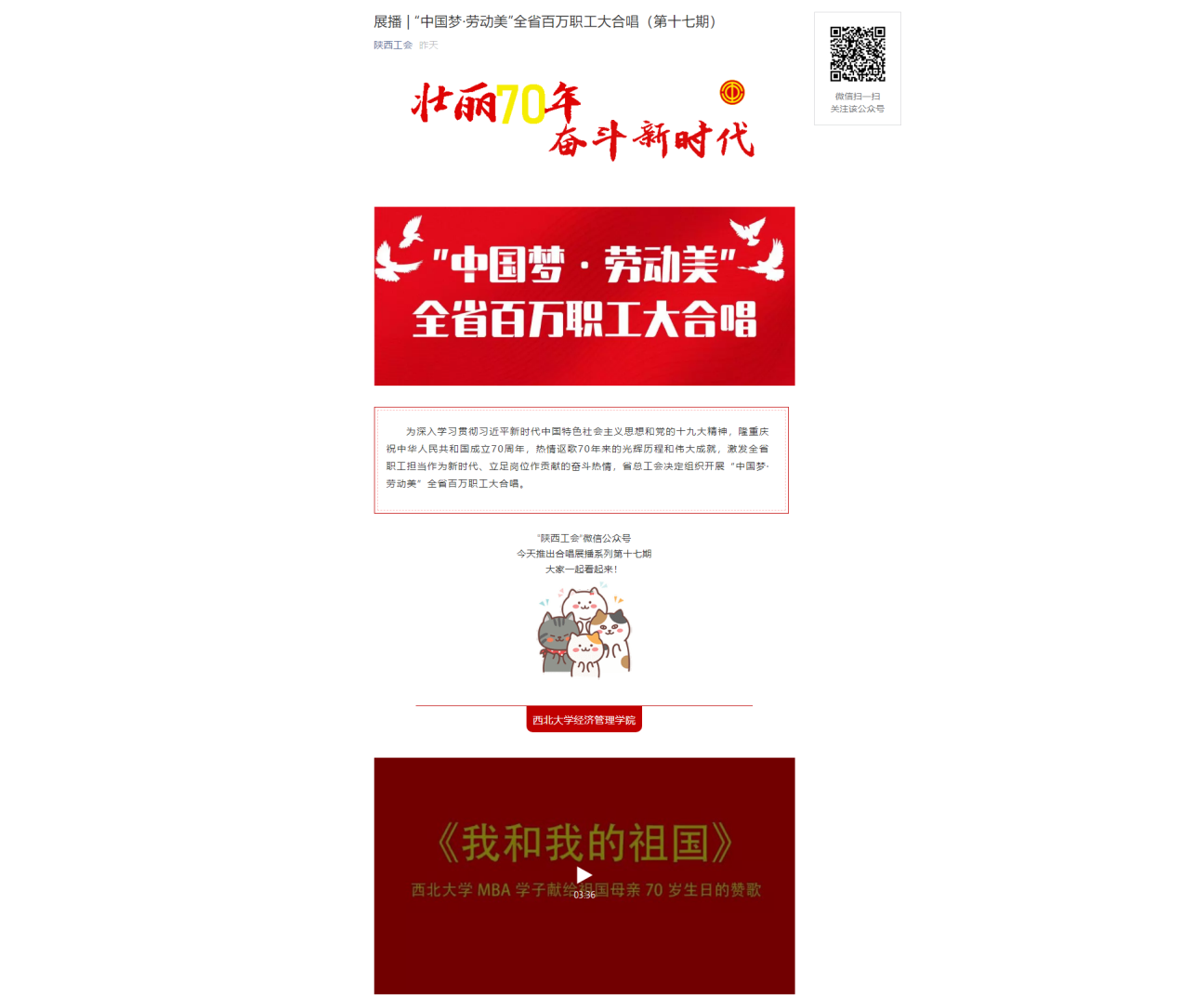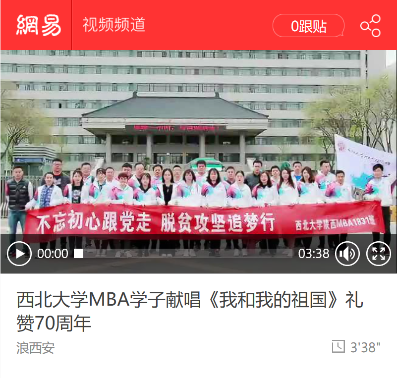 金秋气爽,丹桂飘香。2019年9月21日公司MBA学员唱响《我和我的祖国》,致敬我们伟大的祖国,献礼祖国70华诞。视频在陕西省总工会举办的“中国梦﹒劳动美”百万职工大合唱活动中展播,并在优酷、网易、今日头条等多家媒体网站收录。