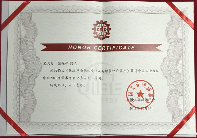 2018年11月3日上午,中国工业经济学会2018年学术年会暨“中国经济高质量发展”研讨会在北京对外经济贸易大学举行。宋文月博士与其导师任保平教授合作的论文《区域产业结构变迁及其增长效应差异》,获得三等奖。