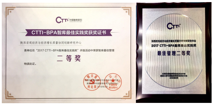 “中国智库索引”(简称CTTI)系统是我国首套全面描述、收集智库数据,为用户提供数据整理、数据检索、数据分析、数据应用等功能的智库索引系统,由南京大学中国智库研究与评价中心联合光明日报智库研究与发布中心联合研发。本次陕西宏观经济与经济增长质量协同创新研究中心获得CTTI最佳智库管理奖,是继2017年度中国西部经济发展研究中心入选CTTI来源智库之后公司智库建设的又一重要成果。也是陕西宏观经济与经济增长质量研究中心继2017年获得陕西省委宣传部颁发2017年度优秀基地后获得的的又一重要荣誉。