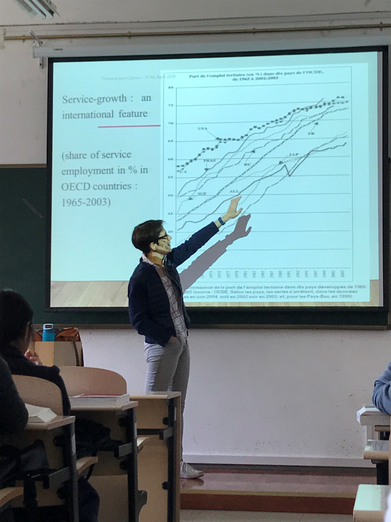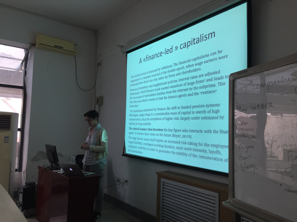 4月19日和26日,Florence Jany-Catrice教授在长安校区分别作了题为《政治经济学——法国调节学派的近期发展》(Political Economy– Recent developments of the French School of the Regulation)和《服务增长的理论—政治经济学视角》(Theories of the service growth– political economy perspective)的学术报告。在第一场报告中,Florence Jany-Catrice教授的报告从法国调节学派的历史入手,介绍了Michel Aglietta的奠基之作« Régulation et crise du capitalisme »,并指出早期的调节学派是以研究美国、英国、法国和德国为主体的,以引入货币机制为重要转折点,延展了货币仅仅作为交换手段的职能,强调了货币作为积累机制的理论观点。教授随后介绍了Robert Boyer教授对于调节学派的发展,重点分析了该宏观经济分析框架随着时间的推移所发生的新变化。在对比主流经济学和调节学派的分析框架时,教授指出经济危机的发生给调节学派的发展提出了许多新问题,她重点分析了2008年全球经济危机爆发之后,全球危机呈现了四个层次的表现形式,例如更加频繁的经济危机和金融泡沫、以收入和财富为代表的经济不平等的加剧、严峻的生态系统危机和可持续发展困境以及原则性危机等等,这些不同的危机表现形式都成为了调节学派近期的主要研究方向。在对比与主流经济学的差别时,Florence Jany-Catrice教授强调了调节学派采用的是历史研究方法,并指出调节学派并不是一种可以“拿来即可使用”的经济学,而是一个由金融、市场、工资-劳动、经济与国家、国际经济等机制组成的综合分析框架,旨在理解宏观经济的状况及其问题。她运用这个框架分析了福特主义、竞争导向资本主义和金融导向资本主义的特征,并尝试分析了中国的宏观经济态势。最后,她指出大量的现实经济问题都成为丰富调节学派的素材,包括追求经济增长和保护自然环境之间的平衡等问题。