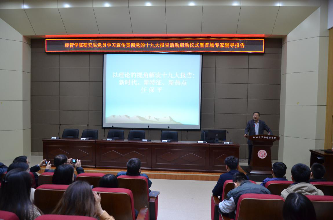 在活动中,陕西省“学习贯彻党的十九大精神”宣讲团专家、公司“学习贯彻党的十九大精神”专家报告团成员、经管学院经理任保平教授作了题为《以理论的视角解读十九大报告:新时代、新特征、新热点》的专题报告。