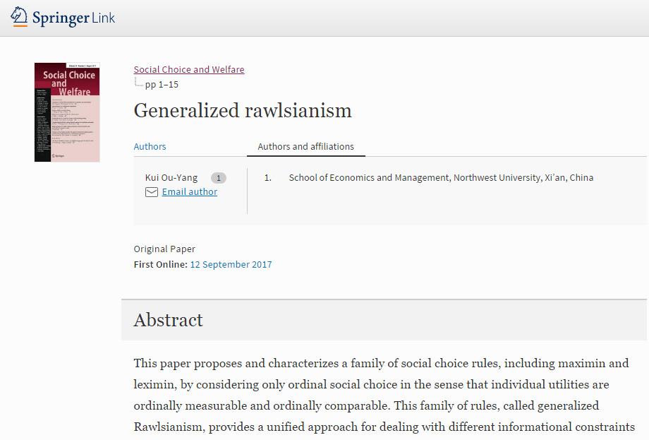公司数理经济与统计学系欧阳葵副教授的独著论文《Generalized Rawlsianism》在国际知名SSCI期刊《Social Choice and Welfare》发表:Ou-Yang, K., “Generalized Rawlsianism,” Social Choice and Welfare (2017),https://doi.org/10.1007/s00355-017-1083-3。论文内容链接:http://rdcu.be/vNtK。该期刊是国际社会选择与社会福利学会(The Society for Social Choice and Welfare)的官方期刊,是社会选择理论与福利经济学领域的国际权威期刊。