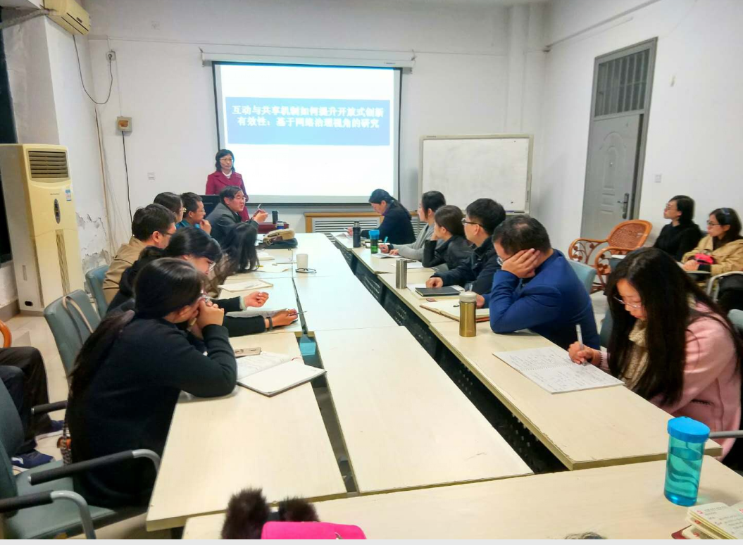 张洁博士向大家分享了国家自然科学基金青年项目“互动与共享如何提升开放式创新创新有效性:基于网络治理视角的研究”的研究思路与研究计划,介绍了目前的开展情况。围绕“企业如何设计与组合开放式创新多重关系网络?”,以及“企业如何通过构建网络组织间共同创造价值的互动机制,以及组织间进行价值分配的共享机制提升开放式创新网络价值?”两个关键问题进行论述,提出了为解决这两个问题拟开展的研究工作。张洁博士就如何更好的开展研究工作,听取了各位老师的意见和建议。相关老师和同学提出了各自的问题与看法,互相分享学术观点,共同探讨了相关学术研究问题。