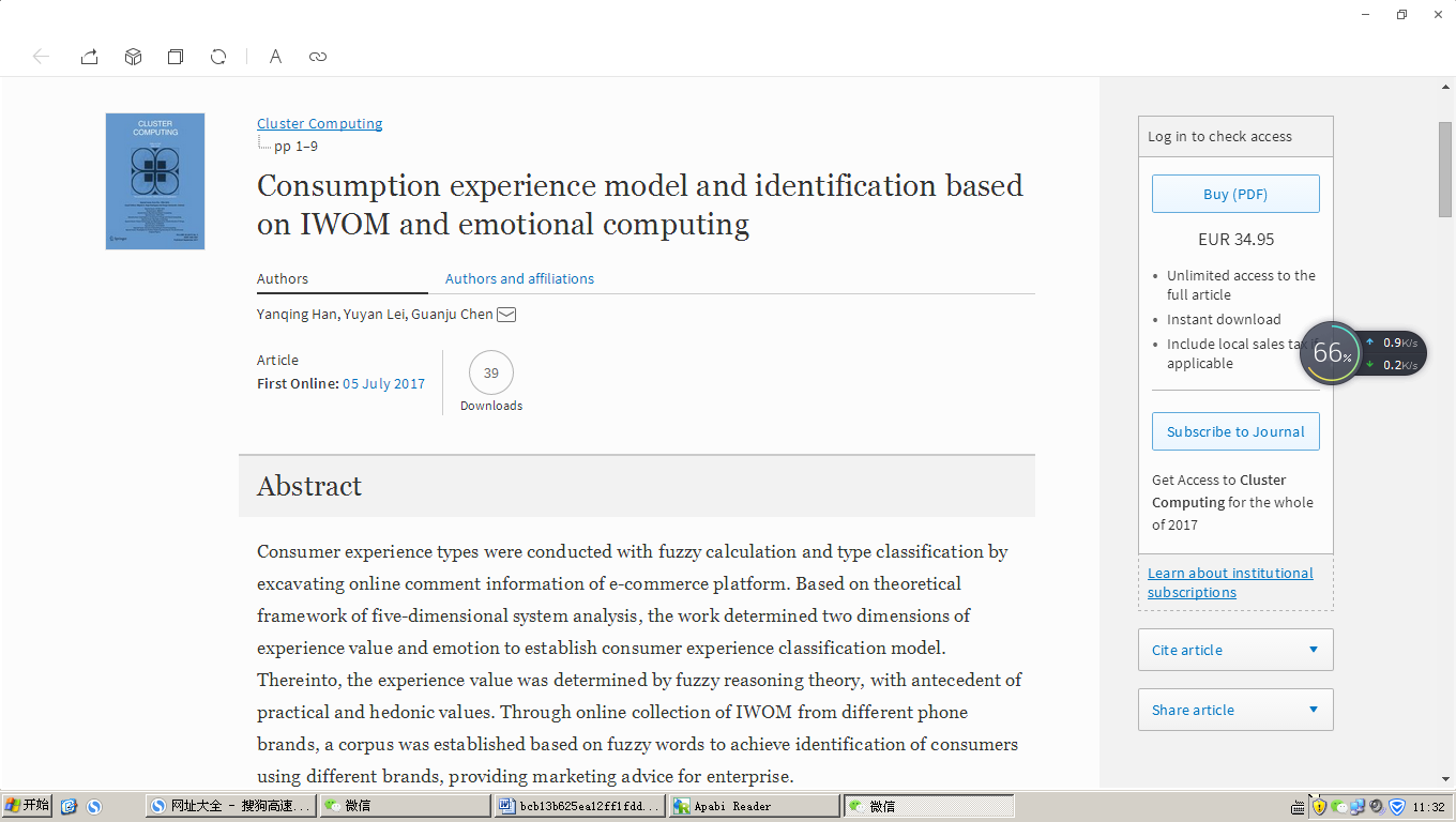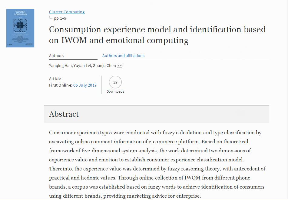 近日,公司博士生韩延庆、雷雨嫣与陈关聚教授在SCI检索期刊《cluster computing》(ISSN: 1386-7857 (Print) 1573-7543 (Online))上在线发表论文《Consumption experience model and identification based on IWOM and emotional computing》。论文链接:https://link.springer.com/article/10.1007/s10586-017-1017-y。《cluster computing》期刊的影响因子(Impact Factor)为2.04。