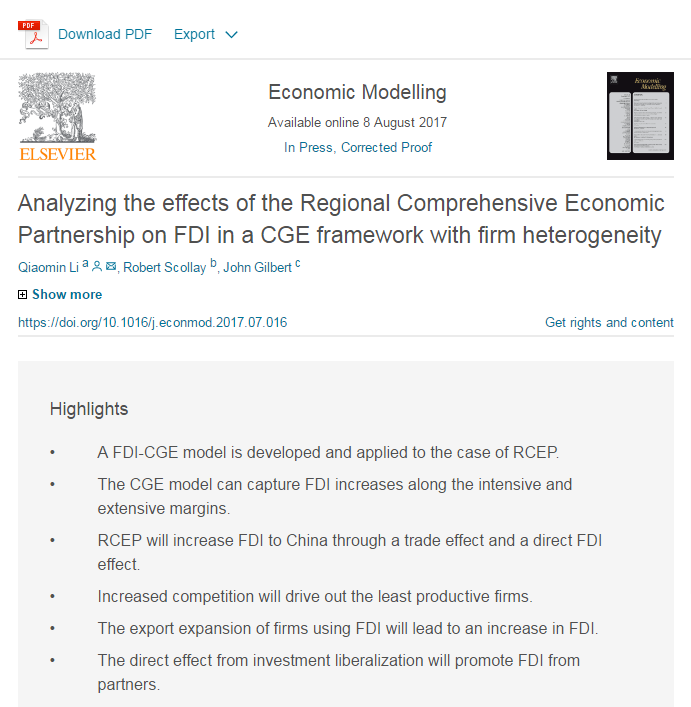 公司世界经济与贸易系教师李侨敏博士的论文《Analyzing the effects of the Regional Comprehensive Economic Partnership on FDI in a CGE framework with firm heterogeneity》在SSCI检索期刊《Economic Modelling》上在线发表,论文链接:http://www.sciencedirect.com/science/article/pii/S0264999317301773 。