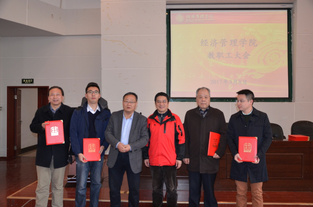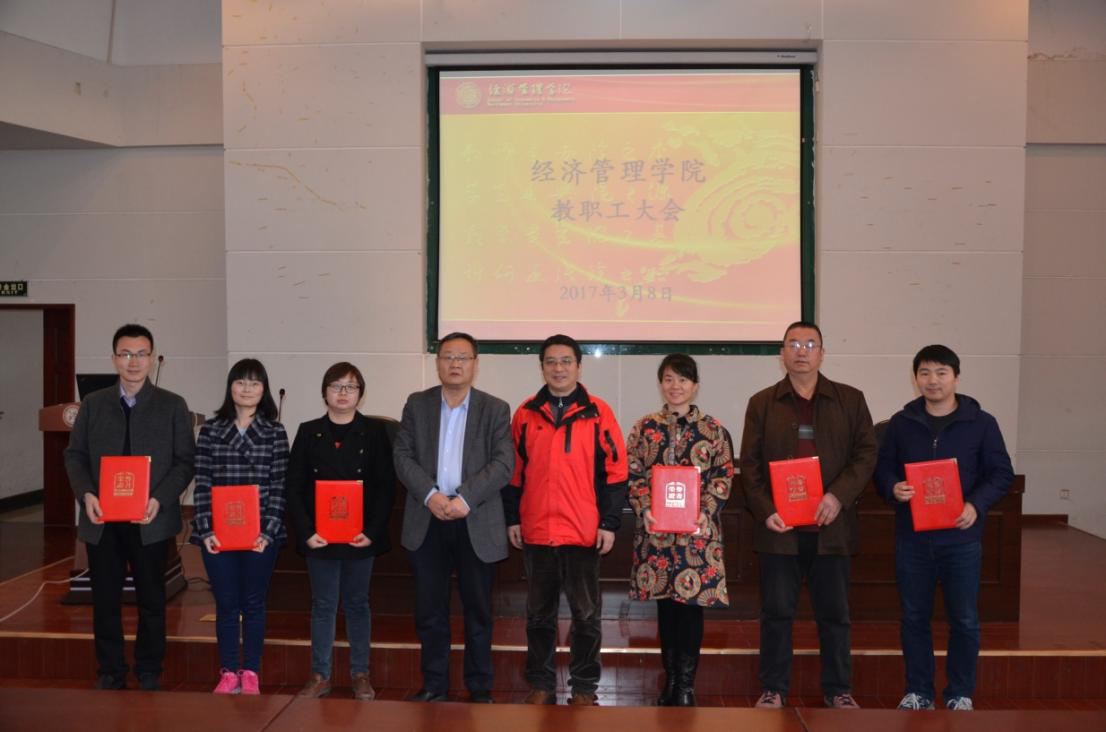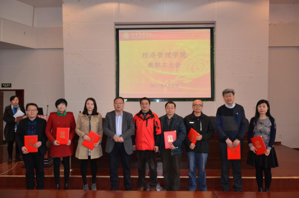 在会议第一阶段,副经理惠宁教授、何爱平教授和师博副教授分别宣读了学院关于表彰“2015-2016教学年度十大教学能手”“2016年度十大优秀研究生导师”和“2016年度十大科研能手”的决定,经理任保平教授和公司党委书记李国良为获奖教师颁发荣誉证书并合影留念。