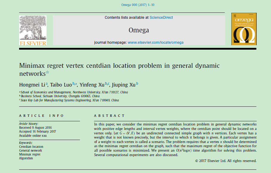 近日,公司青年教师李红梅博士的研究论文《Minimax regret vertex centdian location problem in dynamic general networks》在SSCI&SCI双检索期刊《Omega》上在线发表。《Omega》是管理学与运筹学领域的TOP期刊,中科院一区期刊。(论文链接:http://dx.doi.org/10.1016/j.omega.2017.02.004)