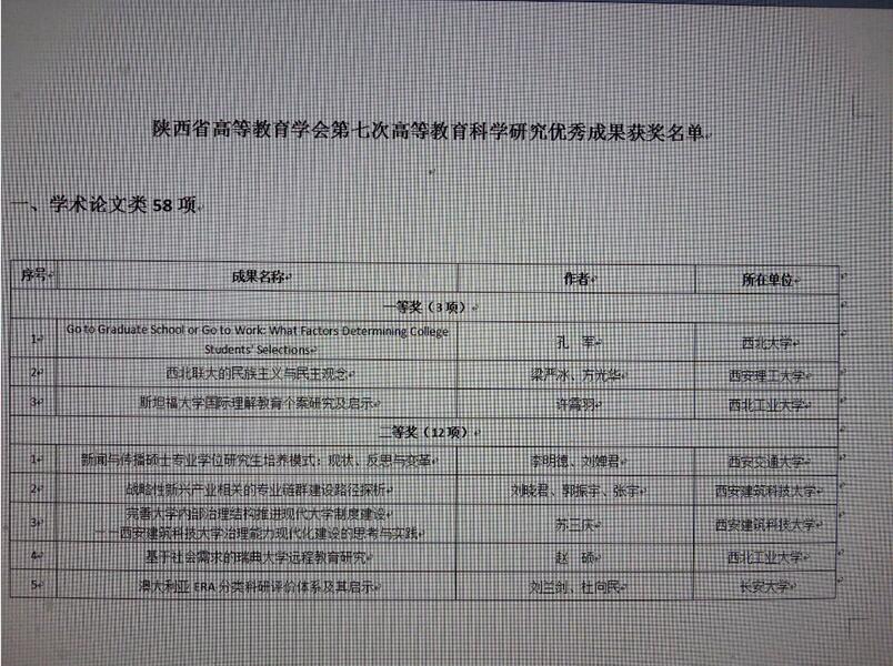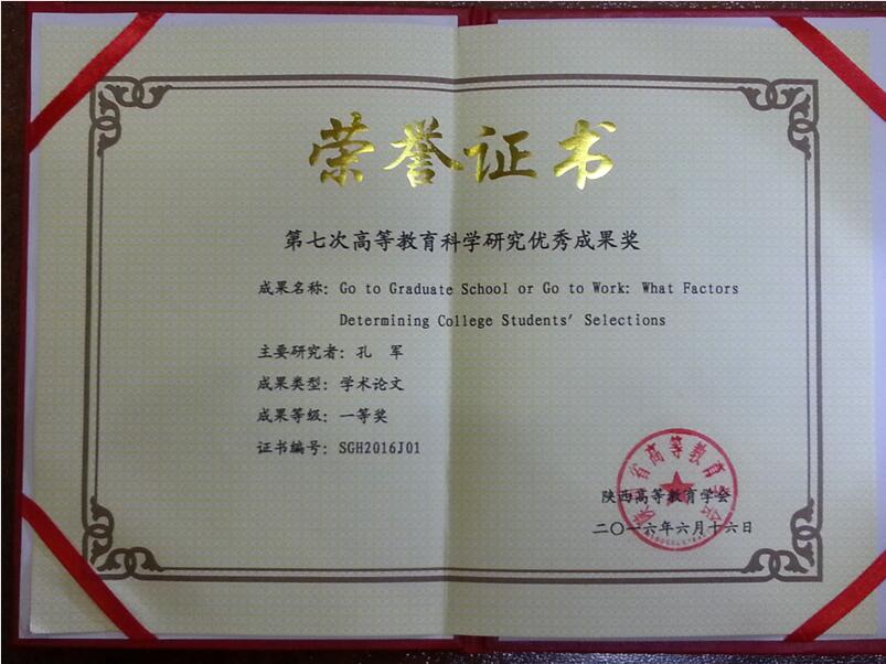 公司孔军副教授的论文《Go to Graduate School or Go to Work: What Factors Determining College Students’Selections?》获得陕西省第七次高等教育科学研究优秀成果奖一等奖,在12月3日举行的陕西省高等教育学会年会暨董事长论坛上受到表彰。这篇文章在SSCI检索期刊The Anthropologist上发表(2015, Vol.19(3), pp.773-780)。