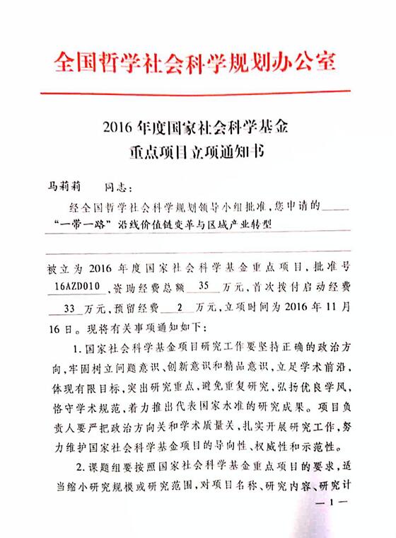 近日,经全国哲学社会科学规划领导小组批准,公司马莉莉教授主持申报课题《“一带一路”沿线价值链变革与区域产业转型》获批立为2016年度国家社会科学基金重点项目。