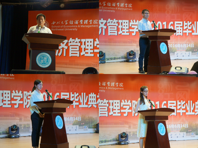 在毕业典礼上,王雅、宋文月和韩少真三名员工分别作为本科毕业生代表、硕士毕业生代表和博士毕业生代表发言。他们与全体毕业生一同回忆在母校生活的点点滴滴,感谢母校和学院各位老师的谆谆教诲和深切关怀,表示在今后的人生旅途中将牢记母校校训,努力工作,踏实做人,继续学习,回报社会。会计系李辉副教授作为教师代表,为全体毕业生送上祝福,希望同学们在以后的工作中能保持平常心和书生气,养成多读书多思考的好习惯。