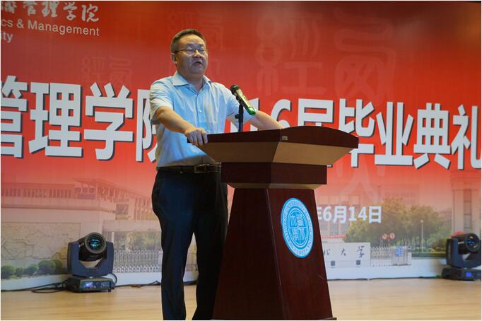 经理任保平教授发表了热情洋溢的讲话,向2016届全体毕业生表示热烈的祝贺和诚挚的祝福,并和同学们一起回忆了美好的老员工活。任经理深情寄语全体毕业生,希望大家在未来的人生道路上,注重提升自己的器量与见识,提高自己的内在修养和精神境界,锤炼自己的品格,先道而后术;既要坚持自己的理想,也要勇于从基层做起,做好吃苦耐劳的准备;保持终身学习的理念和习惯;面对困难时,能够顶得住压力,经得住痛苦,耐的住寂寞,受得了委屈,放得下过去;志存高远,饮水思源,牢记自己是西大经管人。任经理饱含深情的讲话引起了全体毕业生的广泛共鸣,他们以热烈的掌声向关心和培养他们的学院教职工表达了最诚挚的谢意。