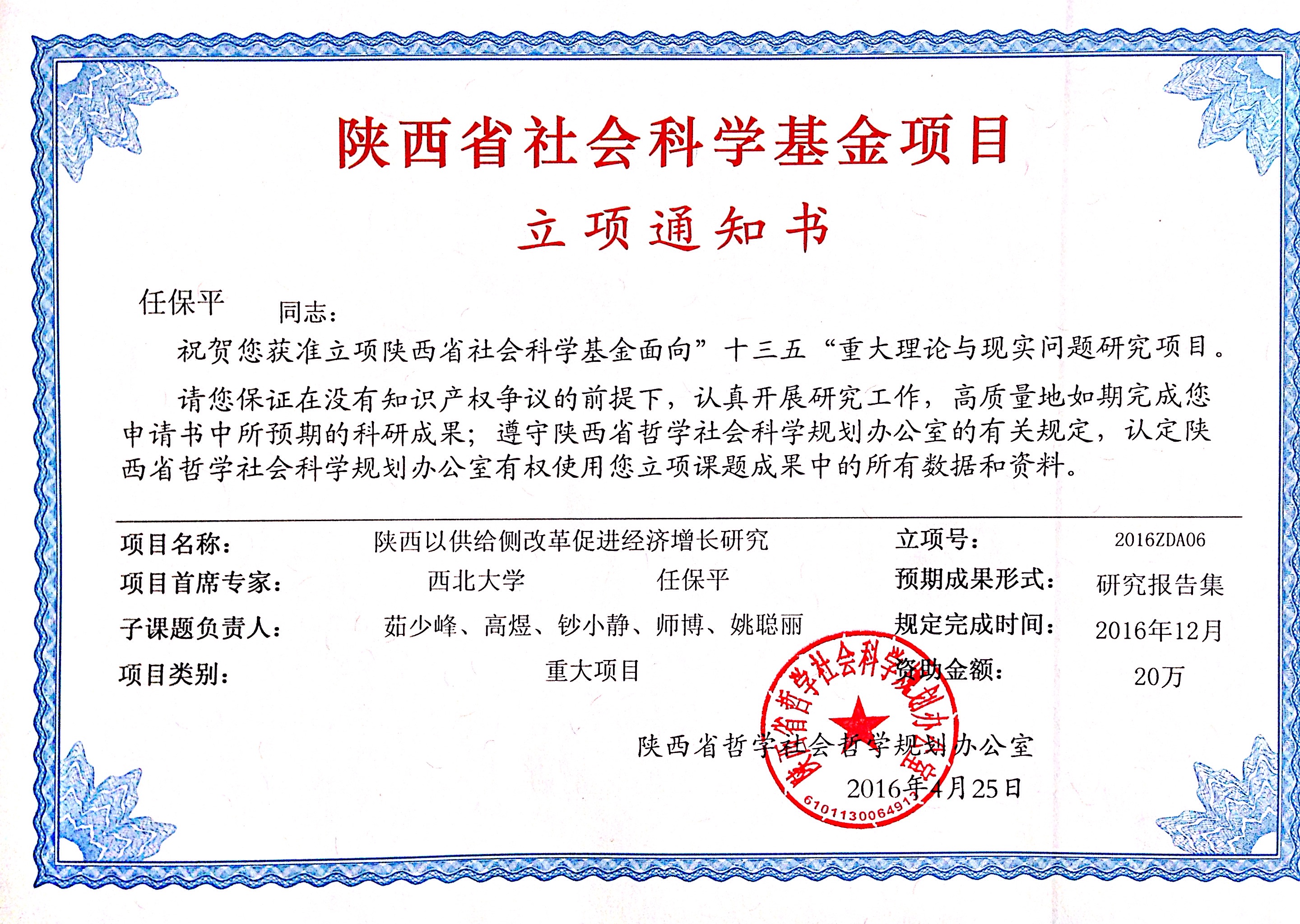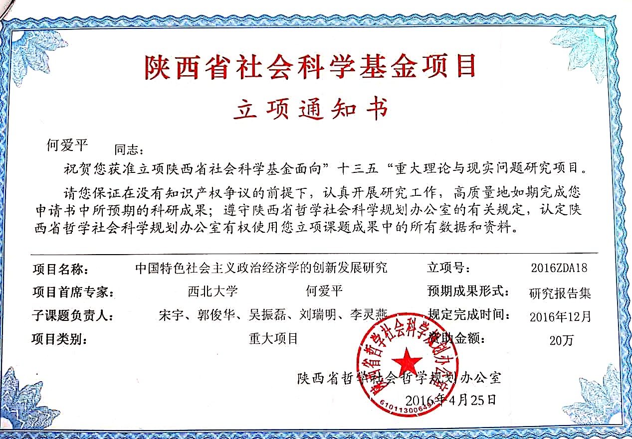 经陕西省哲学社会科学规划领导小组批准,公司任保平教授主持的“陕西以供给侧改革促进经济增长研究”以及何爱平教授主持的“中国特色社会主义政治经济学的创新发展研究”立项为陕西省社会科学基金面向“十三五”重大理论与现实问题研究项目。