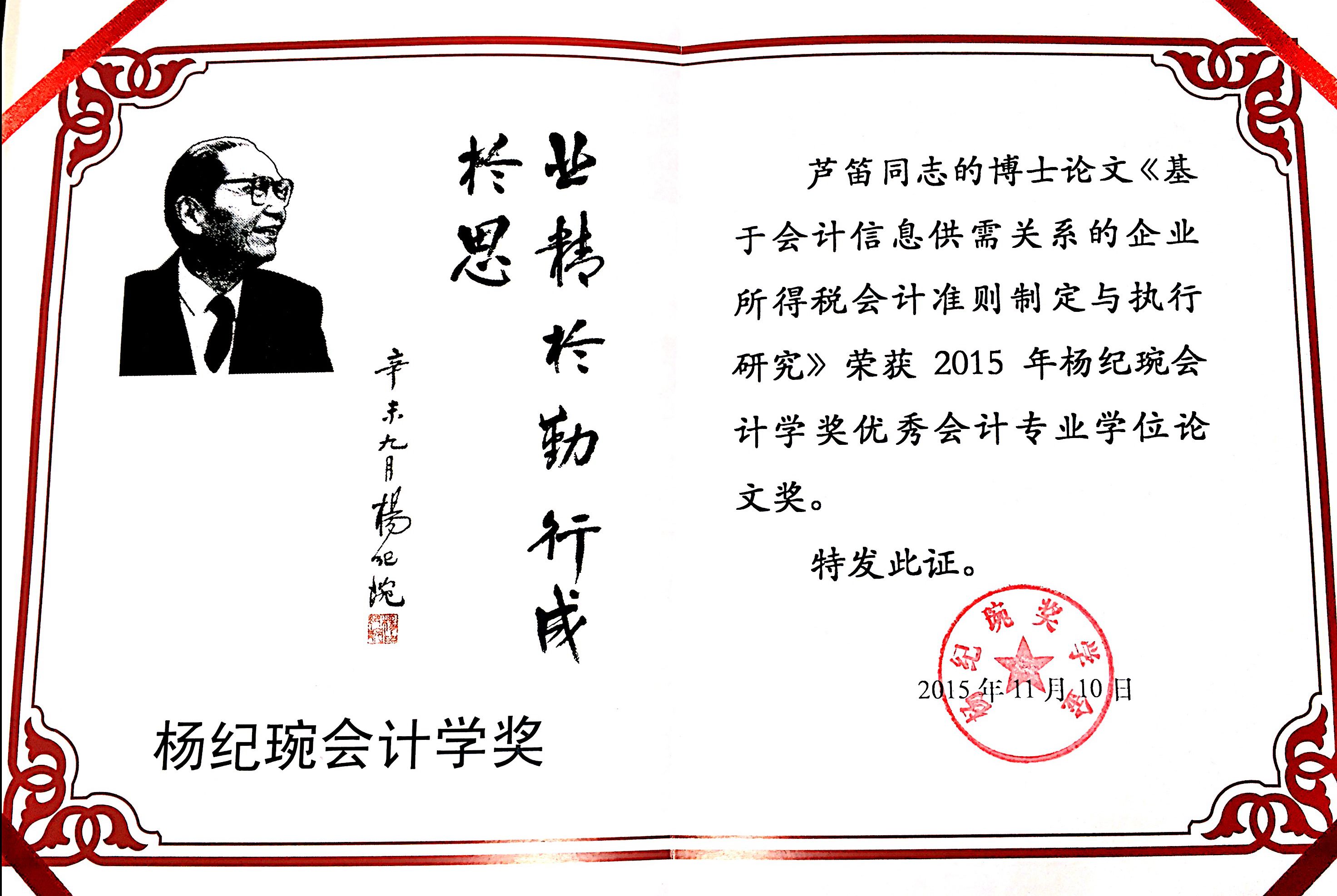 据悉,杨纪琬会计学奖于2002年经财政部审批设立,是中国会计学界的最高奖项,也是中国会计领域的第一个全国范围奖学金,至今已举办七届。2015年“第七届(2015)杨纪琬会计学奖”在全国范围内共评选出优秀博士学位论文3篇,优秀硕士论文3篇,优秀专著2部。本次评选活动中,公司首次获得该奖项。