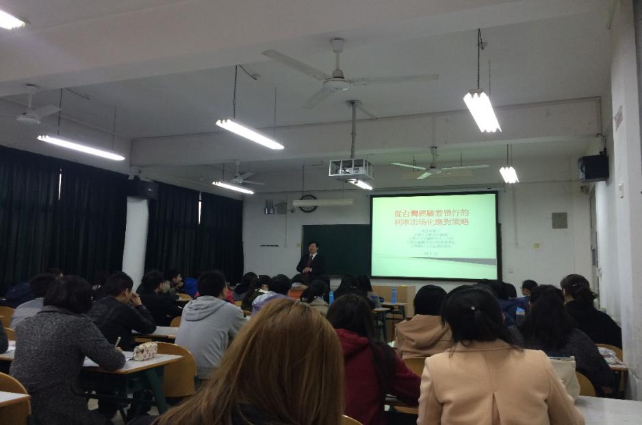 2015年3月17-18日,台湾大学金融学黄达业教授应邀校访问公司。访问期间,黄达业教授为公司金融学等专业本科生、硕士研究生做了题为《从台湾经验看银行的利率市场化应对策略》的讲座,通过分析台湾地区30年来银行业发展的历史及经验教训,重点展示了台湾银行业平均加权存放款利率变动趋势、台湾银行业主要收入变动趋势,对比不同国家与地区利率市场化的进程,介绍了利率市场化下银行的战略。他还与学院高培中心与相关人员进行座谈,重点介绍了“AFMA高级金融管理师”项目。