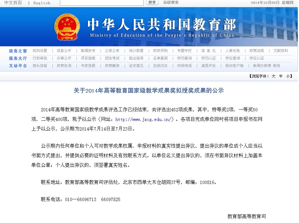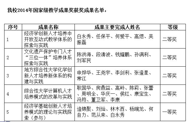 近日,2014年国家教学成果奖评选结果公布,公司白永秀、任保平、何爱平、高煜、吴振磊五位老师完成的《经济学创新人才培养中开放互动式教学体系的探索与实践》荣获2014年国家级教学成果奖二等奖。白永秀教授作为参与人完成的《经济学基础人才培养模式的理论与实践探索》获国家级教学成果奖一等奖。由白永秀教授、任保平教授主编的《中国市场经济理论与实践》(高等教育出版社,第二版)入选第二批“十二五”普通高等教育本科国家级规划教材,这是公司教材建设的标志性成果。