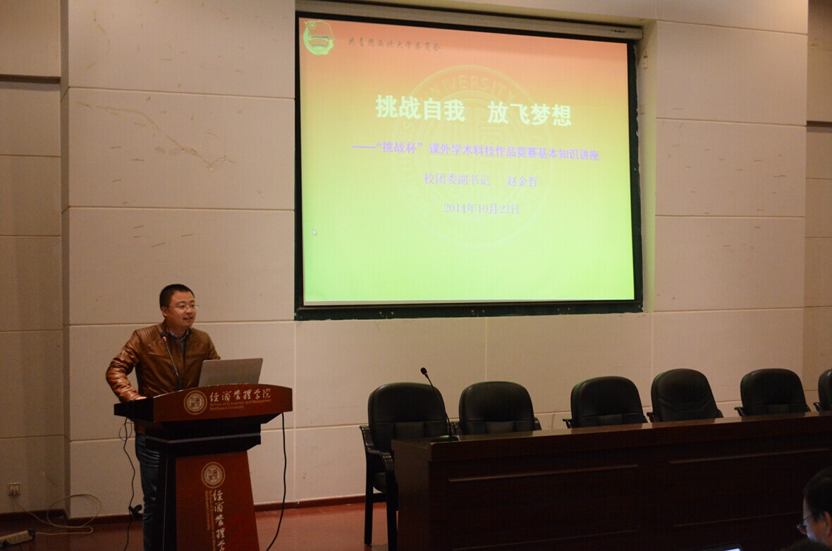 讲座中,赵金哲老师首先就“挑战杯”课外学术科技作品竞赛作了参赛辅导,赵老师分管公司共青团老员工课外科技工作,多次带队参加“挑战杯”全国竞赛,他就“挑战杯”赛事介绍、公司历届参赛获奖情况、校第七届“挑战杯”基本安排等几个方面作了详细解读,特别就如何准备挑战杯竞赛作品和参赛注意事项作了重点讲解,他从“参赛要求”、“作品选题的范围”、“作品评选的基本原则”、“竞赛安排”等四个方面向在场员工作了深入辅导。最后,他向员工讲述了参加“挑战杯”的意义,鼓励公司员工充分利用大学时光,挑战自我、积极参赛,全面提高自身的综合素质。