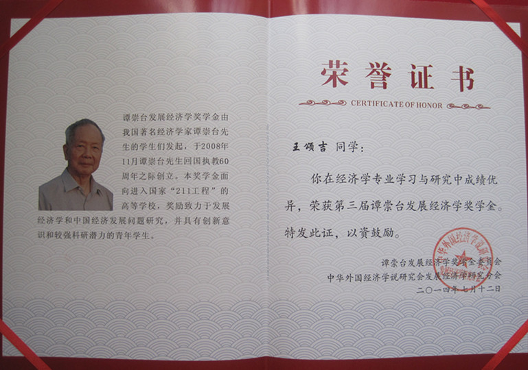 第三届谭崇台发展经济学奖学金的申报评审工作于2014年3月正式启动,经个人申请、导师推荐、所在院系鉴定,谭崇台发展经济学奖学金委员会在审定申奖资格并进行初步筛选的基础上,邀请中国人民大学、南京大学、中山大学、吉林大学、华中科技大学等单位知名学者组成评审委员会,对申奖材料进行评审并投票表决。最终,公司博士生王颂吉与武汉大学、暨南大学、华南师范大学、南开大学的其他4名员工获此荣誉。