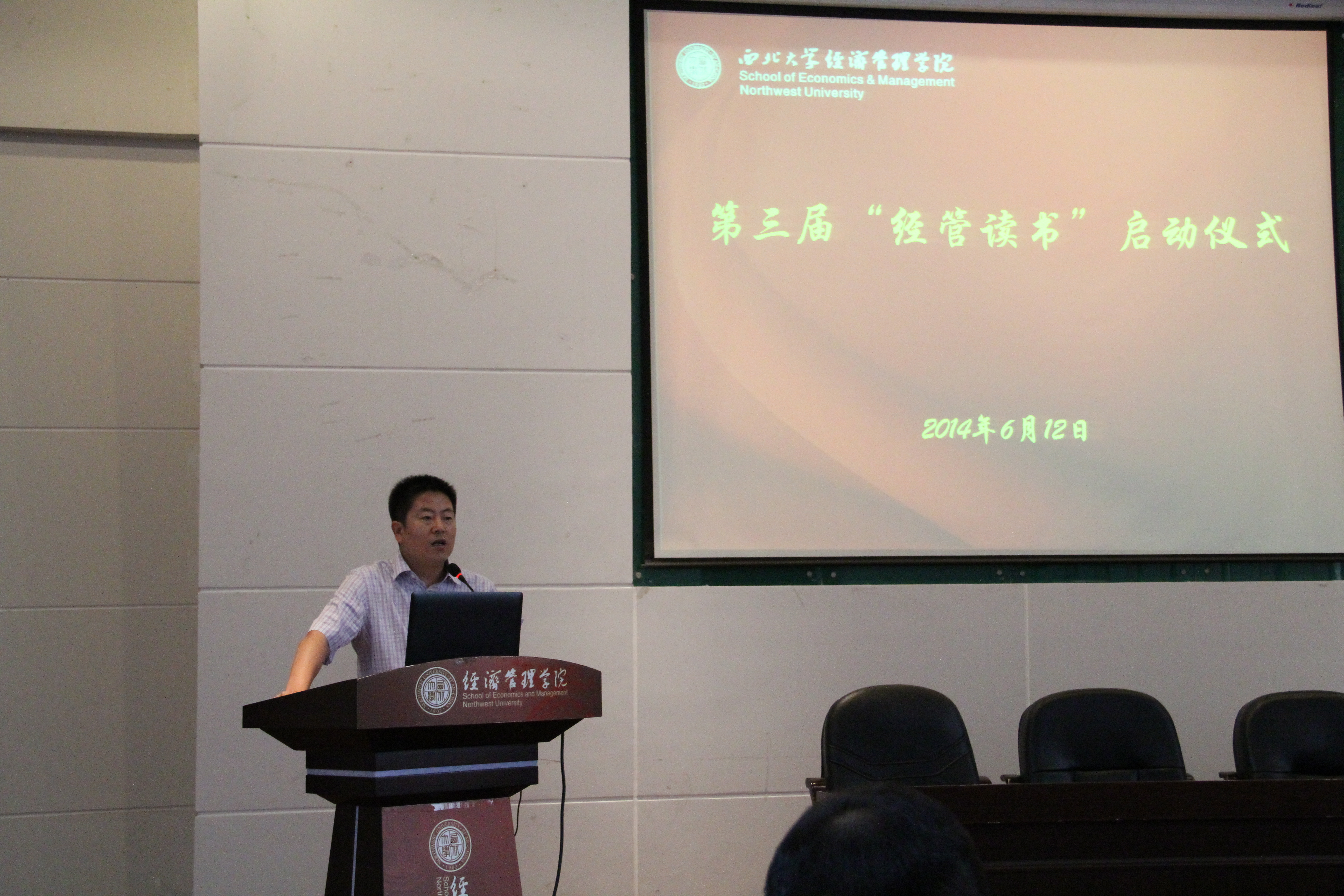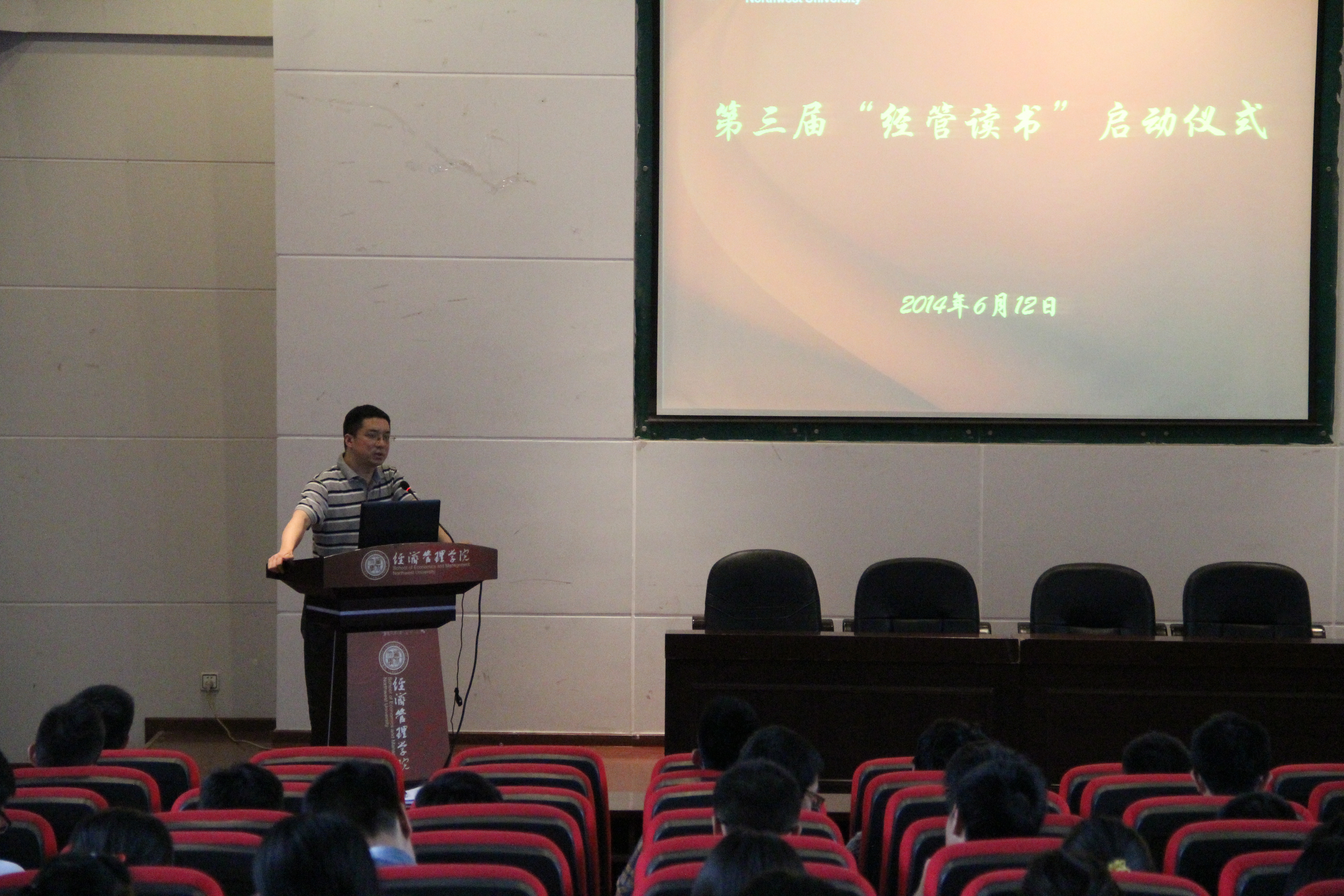 仪式上,公司党委副书记李一凡首先宣讲了本次“经管读书”活动方案细则,并解读了本次活动同过往两届活动的不同点,一是本次读书活动引入了教师参与,学院各个系都推荐了教师担任本次活动的读书导师,指导本科生读懂、读透经典。并组织员工开展各类读书交流活动。二是扩充了读书数目,公布了100本经济类书籍,100本管理类书籍和50本人文类书籍。阅读采取读书小组模式以提高读书效果,三是对读书成果有明确要求,对不同年级提出了难度不同的要求,并要求活动要有延续性。之后本科生代表孙飞扬同学,研究生代表博丹同学分别发言,分享了自己的读书感悟。最后,公司党委书记李国良讲话,李书记为大家列举了多个国家人均阅读量,并引用温总理曾经讲到关于读书关系到一个人的思想境界和修养、一个民族的素质、一个国家的兴旺发达的事例,给予了同学们很好的启发。李书记希望同学们要“爱读书、勤读书、会读书”,挑选真正有益的书籍,掌握正确的阅读方法,使开卷更加有益。至此,第三届“经管读书”活动正式启动。