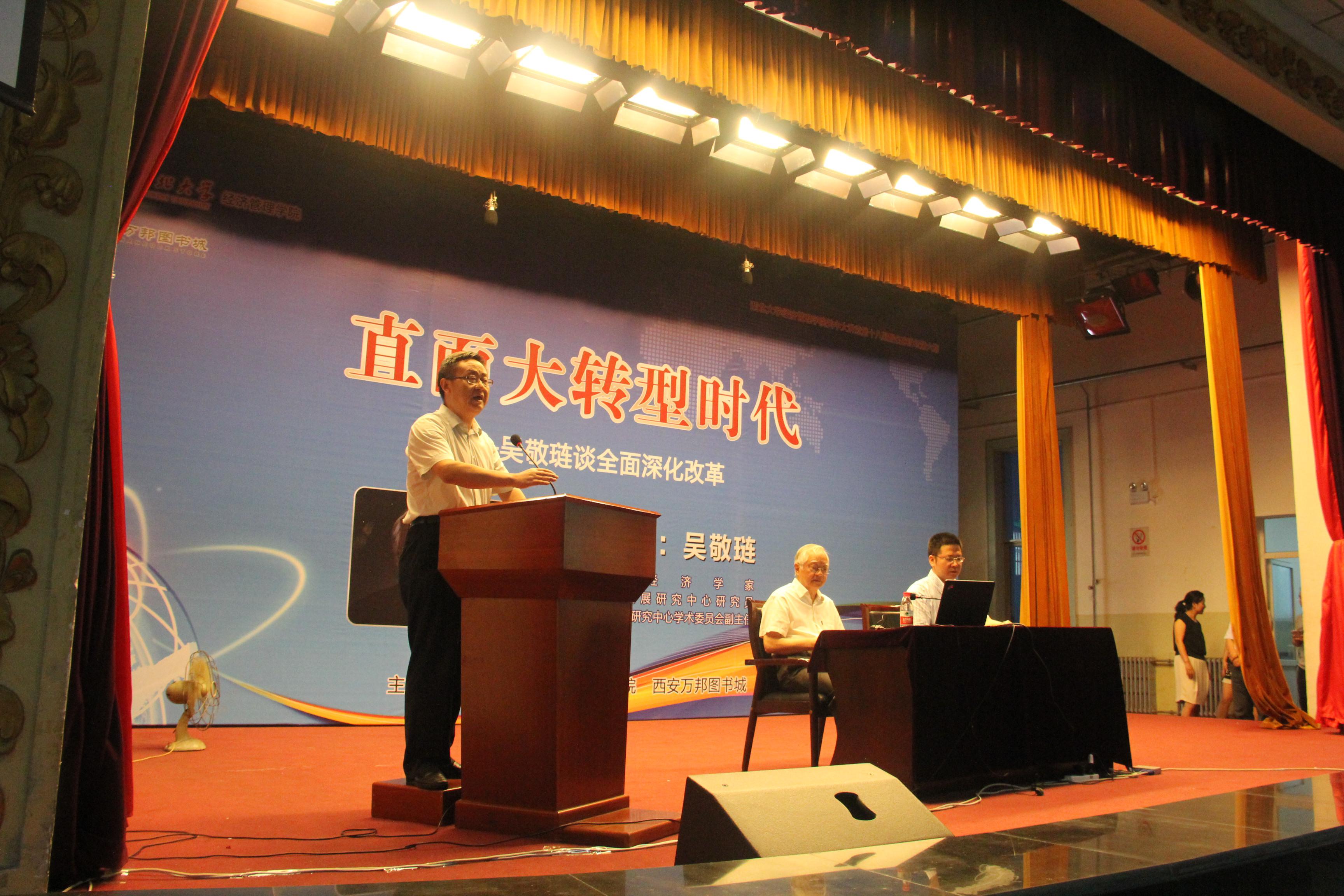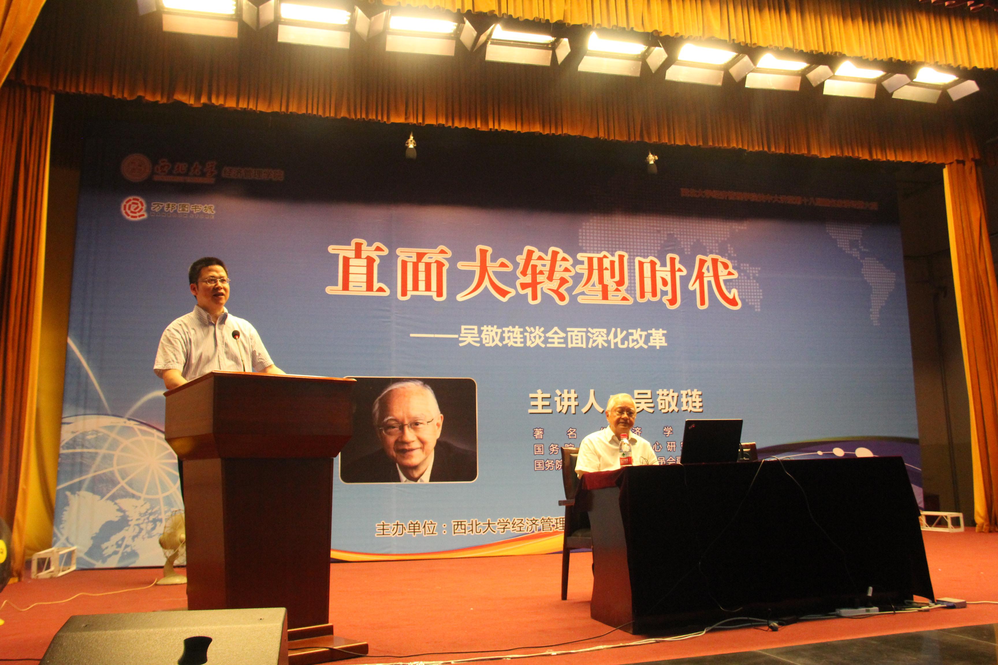 6月22日,公司侯外庐学术讲座第37讲暨经管院关中大讲堂第18讲在太白校区大礼堂成功举行,著名经济学家、国务院发展研究中心研究员吴敬琏教授应邀为公司师生做了题为《直面大转型时代——吴敬琏谈全面深化改革》的学术讲座,讲座由经管学院经理任保平教授主持。