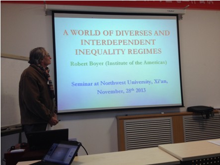 2013年11月28日下午,经管学院高端专家短期教学系列讲座在长安校区8202教室举行。法国经济学调节学派代表人物Robert Boyer教授做了题为“多样化和相互依存、不平等制度构成的世界”(A world of diverse and interdependent inequality regimes)的学术报告。公司经济学博士、硕士及部分教师聆听了报告。报告会由数理经济与统计学系钞小静副教授主持。