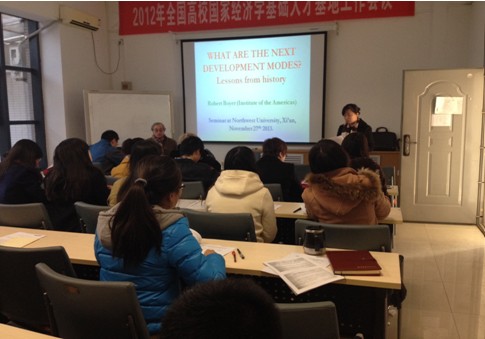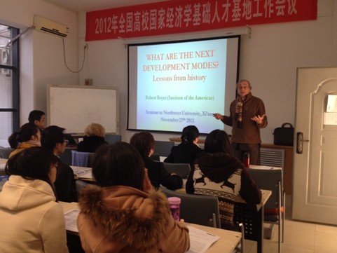 2013年11月27日上午,经管学院邀请国际高端专家短期教学系列讲座在长安校区8202教室举行。法国经济学调节学派代表人物Robert Boyer教授做了题为“增长是否带来繁荣?”(Does growth bring prosperity?)和“未来的发展模式是什么?”(What could be the next development models?)的学术报告。公司经济学博士、硕士及部分教师聆听了报告。报告会由经济学系系主任何爱萍教授主持。