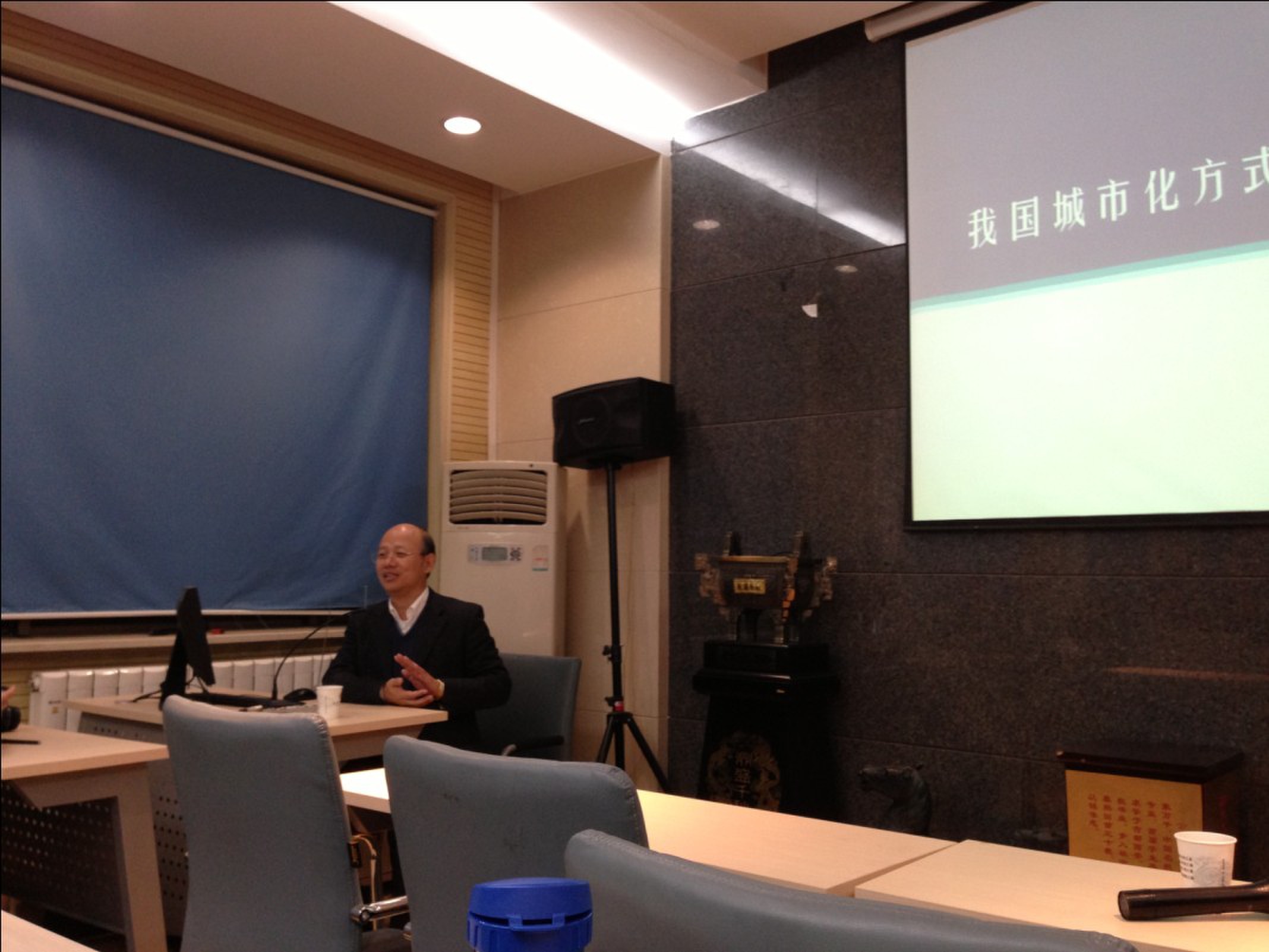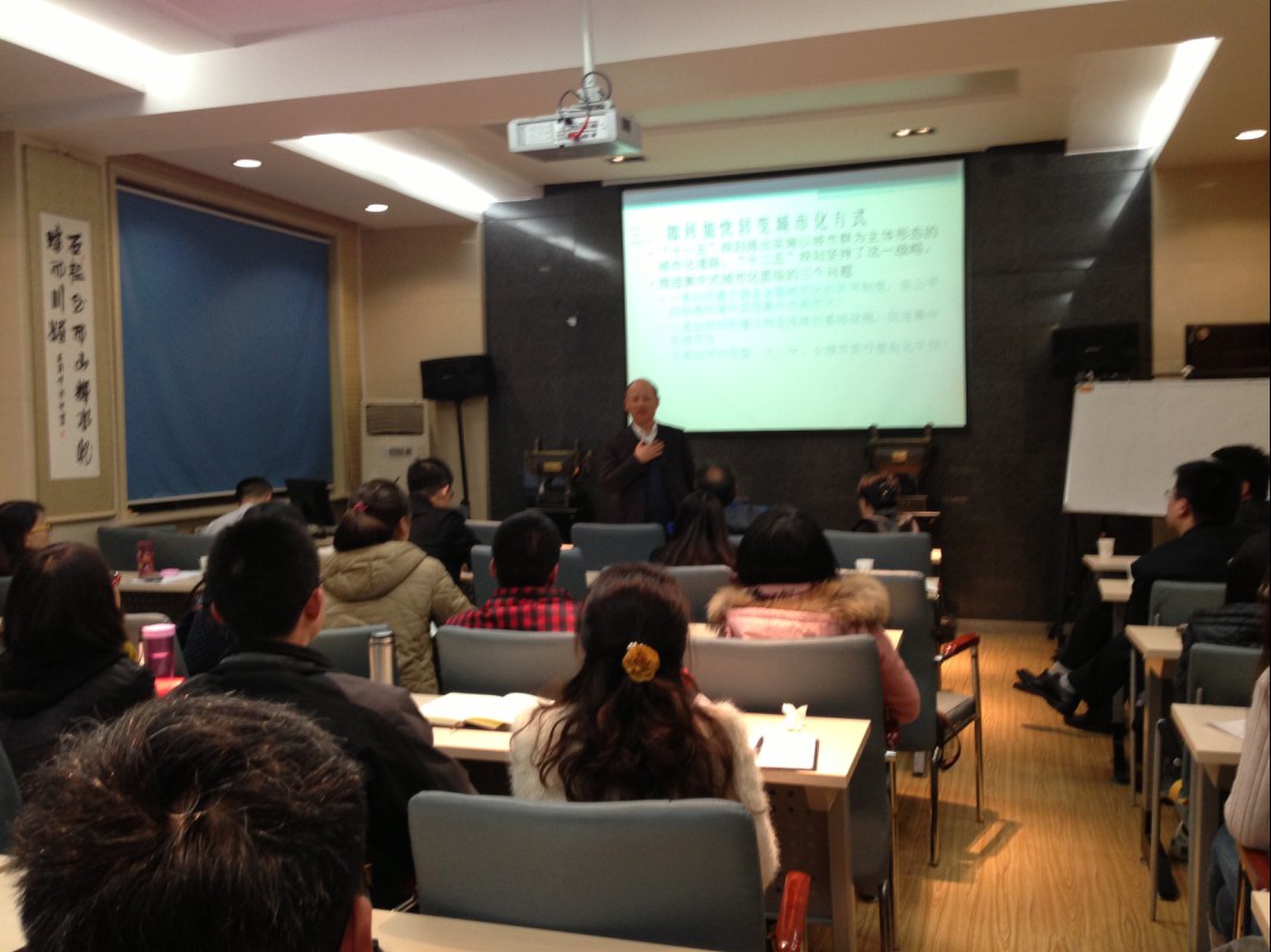 杨开忠教授从:(1)中国城市化——经济发展引擎;(2)集中城市化抑或分散城市化;(3)城市化转型等三个方面对中国城市化发展历程及趋势展开系统论述。杨教授提出城市化的核心与内涵在于城市经济人口的密度不断提升,并从人口、土地、基础设施等维度解析了城市化的经济过程、社会过程与空间过程。在此基础上,杨教授分析了我国城市化发展趋势中的集中化力量和分散化力量,分析我国应推进集中式城市化。最后,杨教授从城市化的共同制度建设、互连的基础设施以及差别化干预视角分析了我国发展集中式城市面临的问题。何爱平教授对杨开忠教授精彩的报告做了点评,她指出杨教授从高层次的国家战略对我国城市化发展进行了解读,无论思想性还是理论性对于教师和员工理解中国城市化进程都具有非常强的启发性。