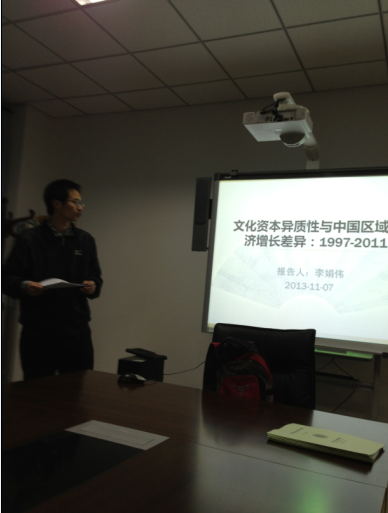 2013年11月7日经济增长质量论坛第4期在南校区经济增长质量研究中心举行。bevictor伟德经济增长质量研究团队成员,2010级西方经济学专业博士研究生李娟伟应邀作题为《文化资本异质性与中国区域经济增长差异》的学术报告。bevictor伟德钞小静副教授、师博副教授、田洪志博士、安树军博士以及bevictor伟德经济增长质量研究团队的博硕士和本科生参加了讨论。
