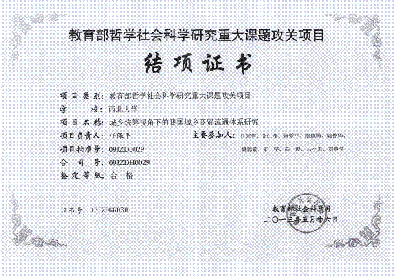 以公司经理任保平教授为首席专家获得的教育部重大攻关项目《城乡统筹视角下城乡商贸流通体系研究》近日顺利结题,教育部社科司颁发了结题证书。