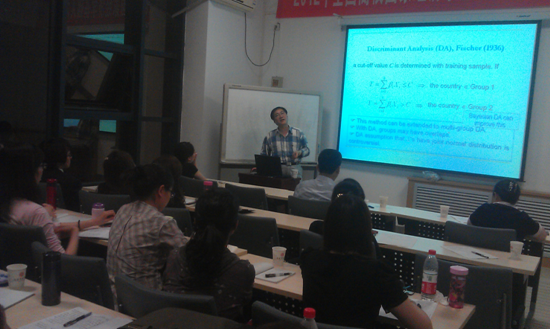 颜黎教授以国家风险若干问题为题,从国家风险的起源、内涵、评价指标构建、评价方法选择等方面进行了系统、全面的讲解,并与与会教师分享和探讨了了其在研究中关注的热点话题。