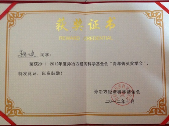 公司2010级西方经济学博士生魏婕于2012年2月通过申报材料初审,被选为该奖候选人。后于2012年3月至9月在中国社会科学院城市与竞争力研究中心实习。在实习期间参与《中国城市竞争力报告No.10》主报告的编写工作并任该书的主编助理,另参与了相关课题、学术研究以及会议等工作。由于实习期表现优异,受到一致好评,于2012年10月魏婕博士被授予2011-2012年度孙冶方经济学基金会“青年菁英奖学金”。