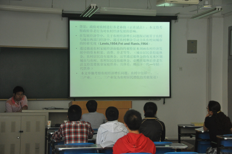 华副教授主持,金融学系刘慧侠副教授做评论人,由学院2009级政治经济学博士江涛做了题为“农村养老保障、代际收入转移与农村经济发展”的报告。学院2007级经济学基地班、2009级数理经济学班专业的员工50多人参加了此次论坛。