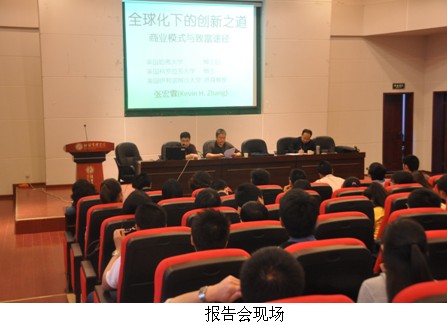 2010年5月20日晚19:00,在南校区经管学院金海恒业报告厅,美国伊利诺州立大学张宏霖教授应邀为公司师生作了一场题为“全球化下的创新之道——商业模式与致富途径”的学术报告。公司李长宏副经理、国际经济与贸易系主任吴航副教授、院办主任杨军良老师以及学院部分博士生、硕士生、本科生代表150多人参加、聆听了报告会。报告会由经管学院副经理李长宏老师主持。