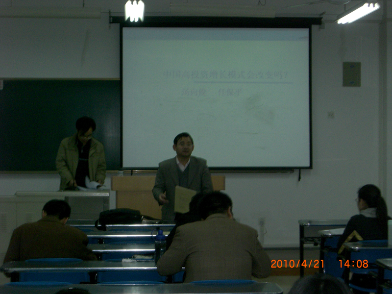 由学院经济学系主办的“现代经济学理论与方法创新论坛”第六卷第十期4月21日下午2点在学校南校区1205教室举行。此次论坛由学院经济学系高煜副教授主持,2008级西方经济学硕士魏婕做评论人,由学院2008级西方经济学博士汤向俊做了题为“中国高投资增长模式会改变吗?”的报告。学院2008级经济学基地班、数理经济学班专业的员工60多人参加了此次论坛。