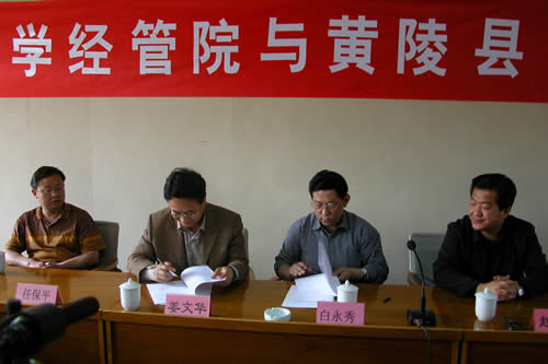 经理白永秀教授、经理助理惠宁教授、经济学系主任任保平教授、黄陵县县委书记赵辉远、县委副书记白桉定、副县长蒋文华以及学院的研究机构和黄陵县各部门负责人出席了签字仪式。双方在项目委托、业务咨询、人才培养、人员交流、建立实习基地等多方面达成了战略合作意向。黄陵县委副书记白桉定主持了签字仪式,经理白永秀教授和黄陵县常务副县长姜文华先生代表双方签字,经理白永秀教授和黄陵县县委书记赵辉远先生分别代表合作双方发表了热情洋溢的讲话,学院和黄陵县人民政府基于合作双赢、相互信任的理念进行战略合作。通过战略合作,利用公司的学科优势、人才优势和黄陵县的地缘和资源优势,实现优势互补,携手发展。通过战略合作,在加快黄陵县县域经济社会发展的同时,为学院的研究提供与实践相结合的平台,为员工实习提供基地。在签字仪式上,除了签订战略合作意向外,还正式签订了《黄陵县“十一五”发展纲要及2020年展望》的协议,拉开了双方合作的序幕。