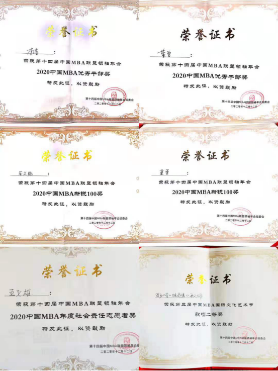 本次活动中,公司荣获“十佳特色商学院”荣誉称号,吴振磊经理获“MBA院校卓越领袖奖”,MBA学员呼延博当选第十四届中国MBA联盟顾委会主任,曹虹获“中国MBA十大成就奖”李浩、董雪获“中国 MBA 优秀干部”奖,朱文艳、董雪获“中国MBA新锐100奖”,王义雄获“社会责任个人奖”、“社会责任志愿者”奖和“歌唱二等奖”,这既是对获奖员工的肯定与鼓励,更是对公司MBA教育项目的认可。本次年会与论坛的交流学习,既是顺应新时代发展的号召与发展需求,更是对商科教育发展,MBA人的成长路径与未来选择、行为的思考和探索,我们期待更多优秀的西大MBA学员在中国MBA联盟的舞台上绽放精彩。