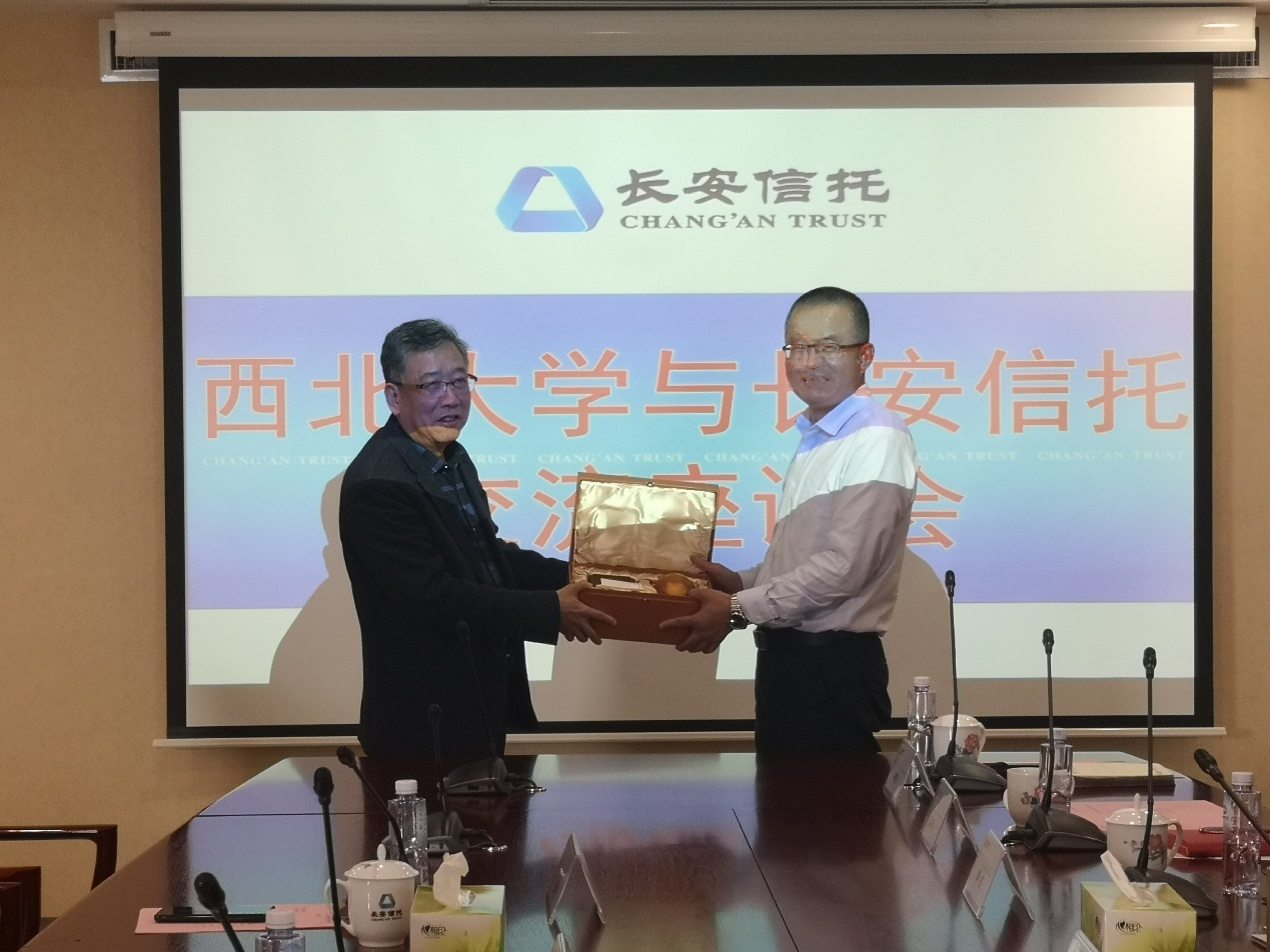 最后,王满仓教授总结到,高校的人才培养应当与用人单位的需求相匹配,培养能够适应市场需求的复合型人才。近年来,学院的团队建设不断取得进步,金融学也在2020年获评了国家一流学科,希望今后加强与企业的深度合作,邀请企业精英来学院做讲座,担任专硕导师,拉近学校与企业的距离,提高学院人才培养质量。座谈结束后,王满仓教授代表学院向长安信托赠送纪念品。