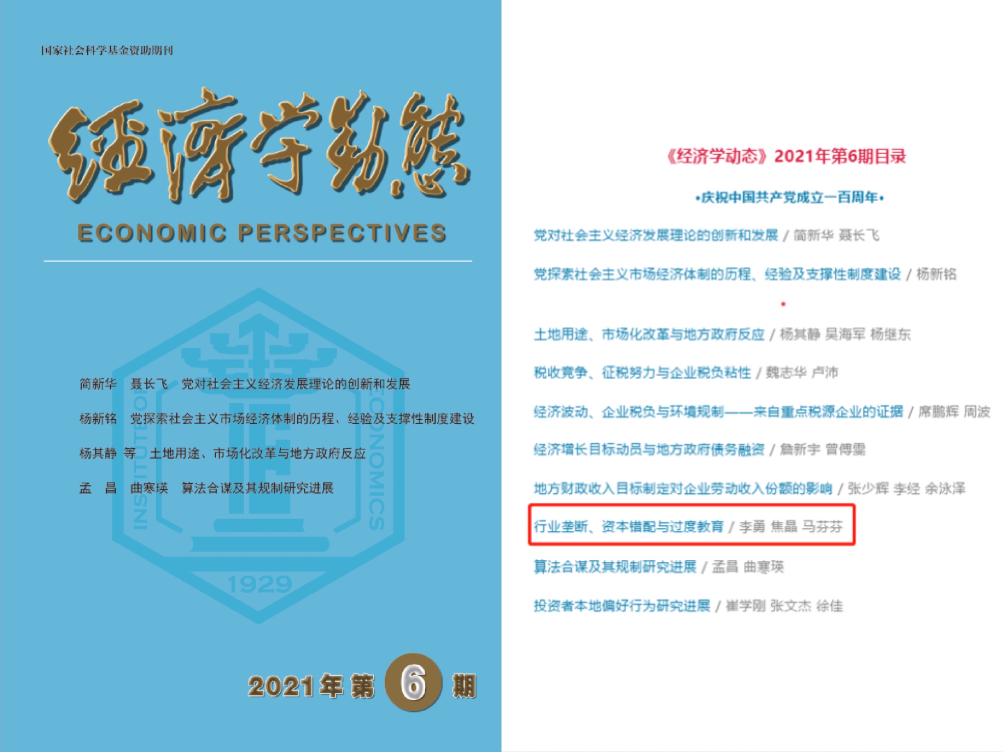 近日,公司教师李勇副教授与合作者焦晶、马芬芬撰写的论文《行政垄断、资本错配与过度教育》,发表在《经济学动态》2021年第6期。该文是作者所承担项目国家自然科学基金青年项目(71704141)和教育部人文社会科学基金青年项目(17YJC790084)的阶段性成果。