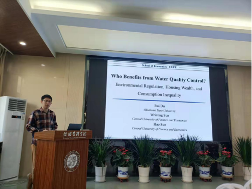 第一场学术讲座由中央财经大学经济学院孙伟增副教授做题为“Who Benefits from Water Quality Control?——Environmental Regulation, Housing Wealth, and Consumption Inequality”的报告,文章从中国的环境规制政策出发,研究了水污染治理如何通过影响住房财富对居民消费不平等产生作用,建立了从宏观环境政策到微观个体消费福利的分析逻辑,为理解环境治理政策的微观效应提供了证据支撑。学院青年教师、博士生围绕政策断点选择的方法、可能存在的反向因果以及实证分析中的其他细节问题与孙老师进行了交流讨论。