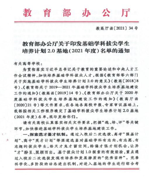 近日,教育部办公厅公布《关于印发基础学科拔尖员工培养计划2.0基地(2021年度)名单的通知》,公司“经济学拔尖员工培养基地”成功入选。