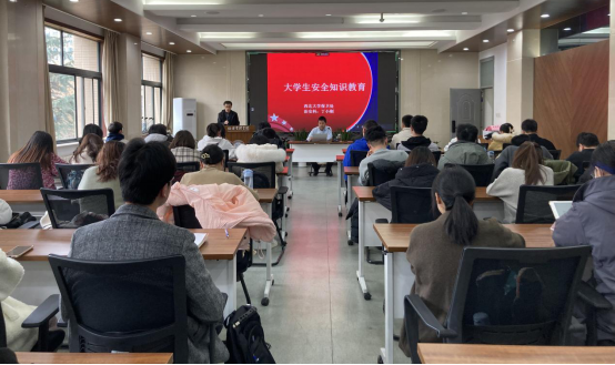 讲座中,丁小刚以介绍公司长安校区的治安形势开篇,深入浅出地向同学们具体讲解了防盗、防抢劫、防抢夺、防电信诈骗与防火等安全防范知识,同时运用大量学校以往发生过的信贷诈骗、宿舍火灾等真实案例,更为生动地强调了校园安全问题的重要性。随后就老员工如何增强安全防范意识、提高自我保护能力,丁小刚向同学讲解了学校报警电话信息等一些应急处理安全问题的切实方法,真诚嘱咐同学们应当严格遵守学校安全规范,切实提高自身防范意识,对于电信网络诈骗、校园贷等违法犯罪行为一定要擦亮双眼,常怀警惕之心,牢记“安全无小事”的良言忠告。