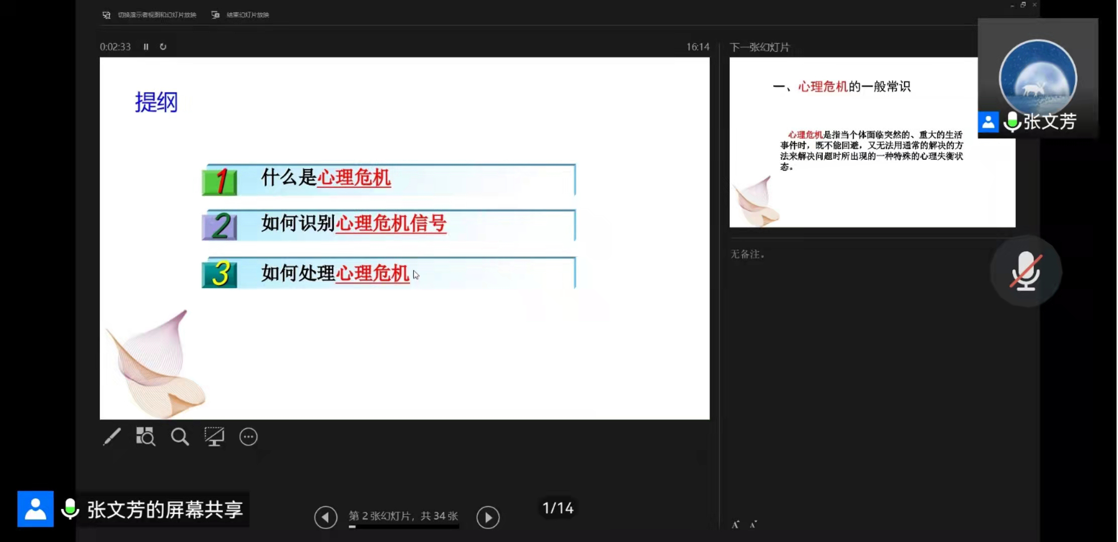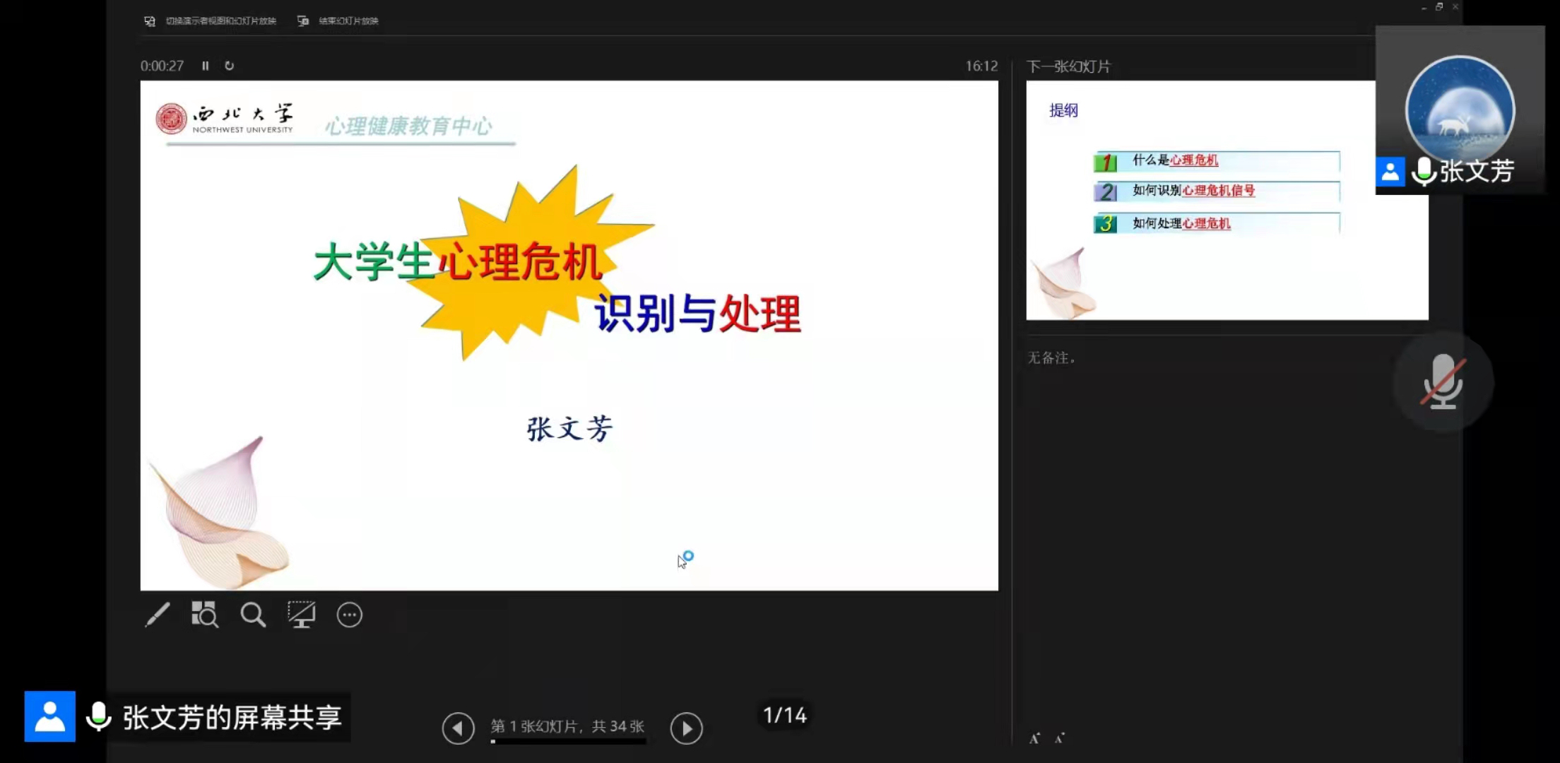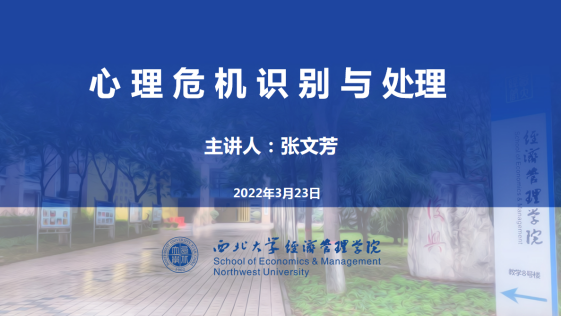 2022年3月23日下午4点,学院邀请bevictor伟德心理健康教育中心张文芳老师线上为心理委员、宿舍舍长、心理协会成员开展了题为“心理危机识别与处理”的心理讲座。讲座由学院心理专干、辅导员戴昶主持,参与讲座人数逾百人。