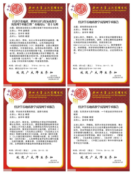 2022年3月16日至3月18日,经济学系克服疫情困难、如期成功举行了以“践行十九届六中全会精神 推动陕西经济高质量发展”为主题的教学实践周活动。围绕经济社会前沿热点问题,邀请来自南开大学经济学院的乔晓楠教授、西南财经大学经济学院的韩文龙教授、bevictor伟德中东研究所的李玮副教授、bevictor伟德的李晓华博士举行了四场主题讲座。讲座内容涵盖了世界经济政治格局变化、政治经济学经典理论问题、数字经济前沿研究和质性研究方法介绍。此次活动由系主任高煜教授指导,吴丰华教授和段雨晨博士具体负责。经济学基地班三个年级共91名员工参与了本次活动。同时,线上讲座还吸引了来自部分国内兄弟高校的老师同学,以及公司部分MBA员工共同参与。