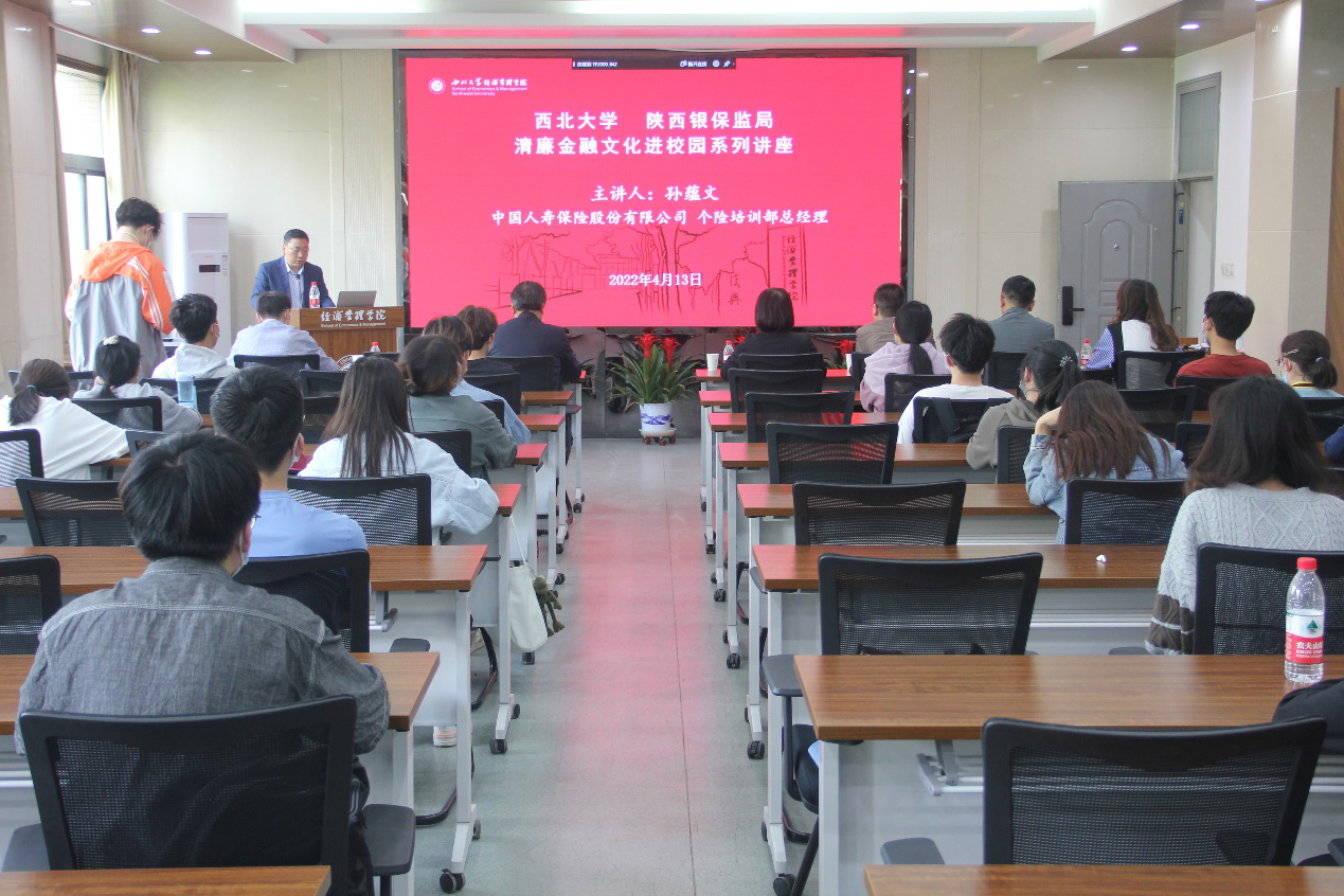 按照bevictor伟德与陕西银保监局开展清廉金融文化共建活动的安排,4月13日,中国人寿保险股份有限公司陕西省分公司个险培训部总经理孙蕴文应邀到校,为bevictor伟德师生做了本学期清廉金融文化系列讲座第一讲,题为《勇立潮头,展望保险行业发展》。bevictor伟德党委副书记、纪委书记,陕西省监察委员会驻bevictor伟德监察专员李邦邦,陕西银保监局纪委办张津崇副主任,中国人寿保险股份有限公司陕西省分公司纪委办杨雨、罗菁华,公司党委书记杜勇和学院40余名师生出席了本次活动。李邦邦致辞,并为孙蕴文颁发清廉金融文化客座讲师聘书,讲座由杜勇主持。