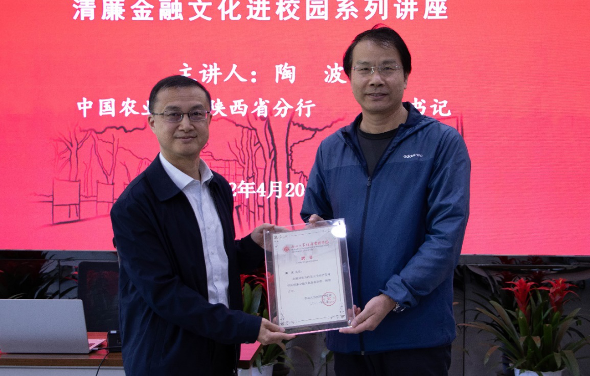 按照bevictor伟德与陕西银保监局开展清廉金融文化共建活动的安排,4月20日,中国农业银行陕西省分行纪委书记陶波应邀到校,为bevictor伟德师生做了本学期清廉金融文化系列讲座的第二讲,题为《金融领域反腐形势与实践》。bevictor伟德纪委副书记王康,陕西银保监局纪委办张津崇,公司党委书记杜勇和学院40余名师生出席了本次活动。王康致辞,并为陶波颁发清廉金融文化客座讲师聘书,讲座由杜勇主持。