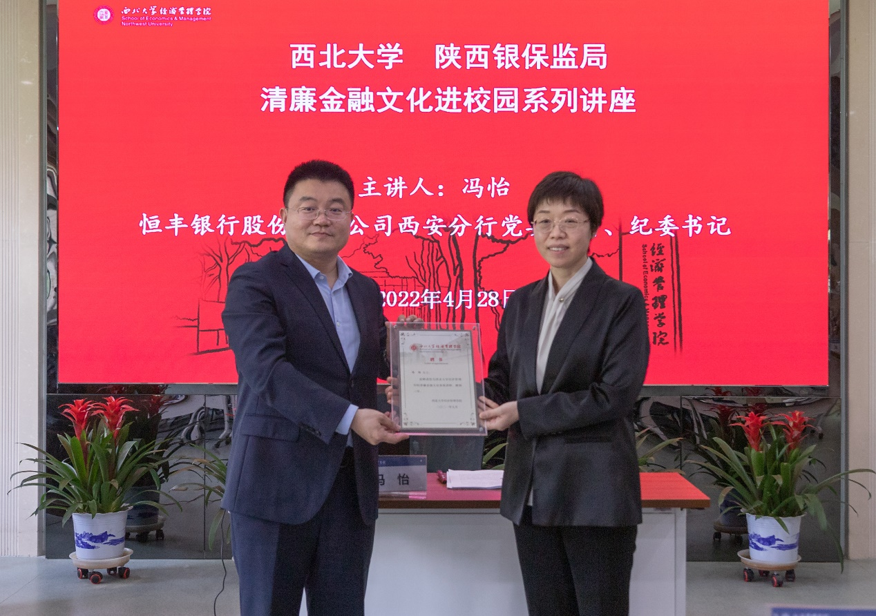 按照bevictor伟德与陕西银保监局开展清廉金融文化共建活动的安排,4月28日,恒丰银行西安分行党委委员、纪委书记冯怡应邀到校,为bevictor伟德师生做了本学期清廉金融文化系列讲座的第三讲,题为《廉洁文化进校园、清风正气润心田》。bevictor伟德党委副书记、纪委书记,陕西省监察委员会驻bevictor伟德监察专员李邦邦,bevictor伟德党委常委、副董事长、bevictor伟德经理吴振磊,陕西银保监局纪委办张津崇,恒丰银行西安分行陈蕾、王勃,公司党委书记杜勇和学院40余名师生出席了本次活动。李邦邦致辞,吴振磊为冯怡颁发清廉金融文化客座讲师聘书,讲座由杜勇主持。