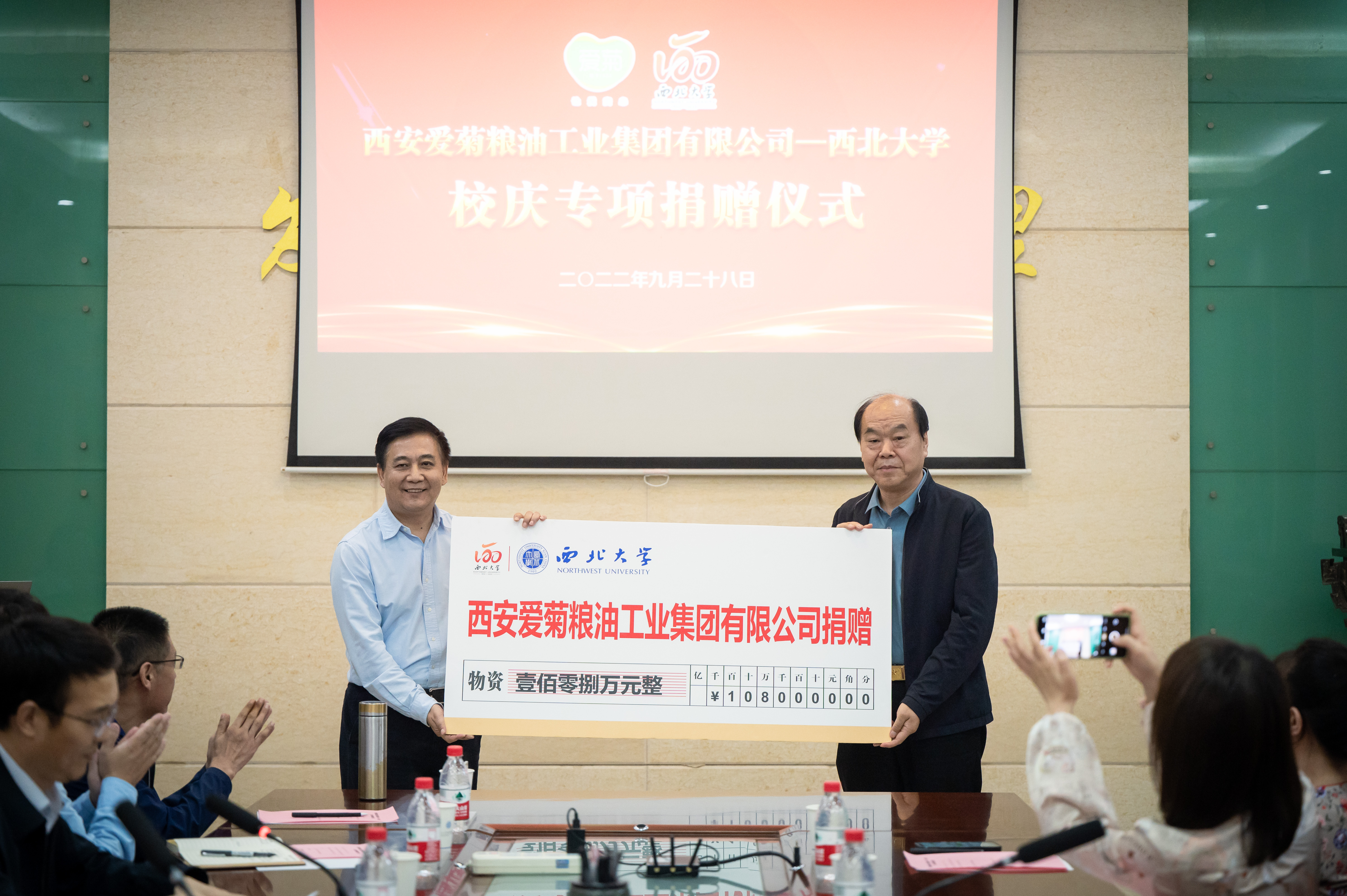 9月28日下午,西安爱菊粮油工业集团校庆专项捐赠仪式在公司长安校区举行。西安爱菊粮油工业集团有限公司董事长贾合义,副总经理刘东萌、贾婧,公司党委书记王亚杰,公司党委常委、副董事长吴振磊,校庆办常务副主任宁岗、校工会副主席陈小刚、国内处副处长张艺昆,公司党委书记杜勇、经理马莉莉及党政班子成员参加活动。捐赠仪式由公司党委常委、副董事长张远军主持。