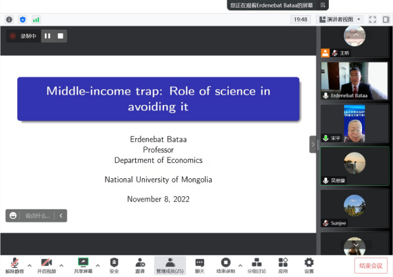11月8日,学院邀请蒙古国立大学Erdenebat Bataa教授做了题为“资源财富管理与跨越中等收入陷阱”的学术讲座,讲座由宋宇教授主持。学院教师和硕、博研究生等参与了本次线上讲座。