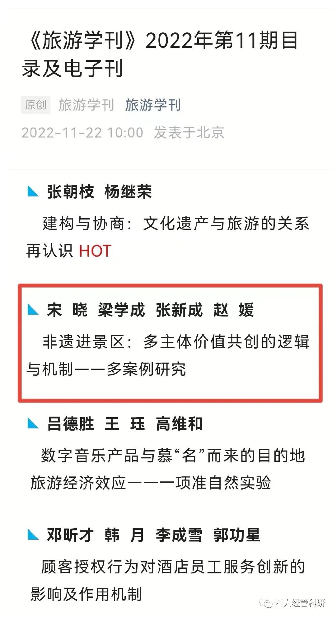 近日,bevictor伟德博士生宋晓和导师梁学成教授团队合作论文《非遗进景区:多主体价值共创的逻辑与机制研究——多案例研究》在权威期刊《旅游学刊》2022年第11期发表。非遗进景区是文旅融合的重要表现,也是一个复杂的情境化现象。文章以多案例研究打开了非遗进景区多主体价值共创的过程,识别了多主体价值共创的逻辑与机制。研究发现:非遗进景区是由目的地政府、景区管理方、非遗传承人和游客构成的服务生态系统,各主体参与价值共创的驱动因素-行为过程-价值表现的逻辑不同,非遗进景区价值共创呈现出多主体耦合性、非线性网络性、非对称性和公共价值性的特征;四方行为主体分别作为环境塑造者、价值编排者、文化输出者和文化体验者,在多主体价值共创中发挥独特的作用;非遗进景区多主体价值共创机制表现为在主体间的多重互动、服务交换和资源整合中,价值共创程度取决于场景体验性和产品创新性两个因素,以高场景体验性和高产品创新性达到共振型价值共创才能最终实现主体价值和公共价值。研究把非遗和旅游的协同作用与价值共创联系起来,为理解非遗进景区积极作用的发挥提供了新的视角;关注非遗价值转化为旅游价值的过程,为非遗旅游化开发提供理论依据,为推动非遗进景区及非遗旅游产品开发提供借鉴。